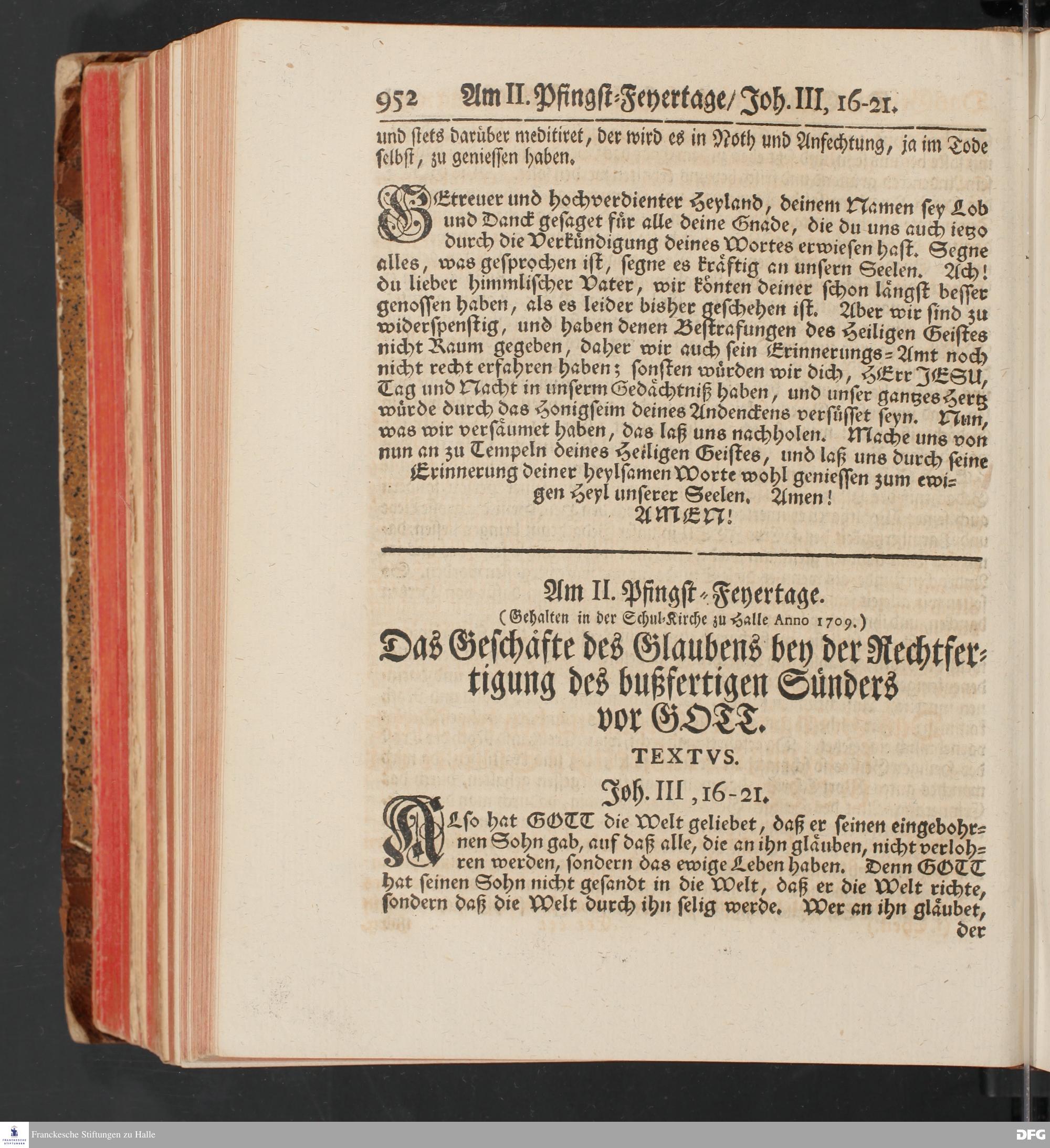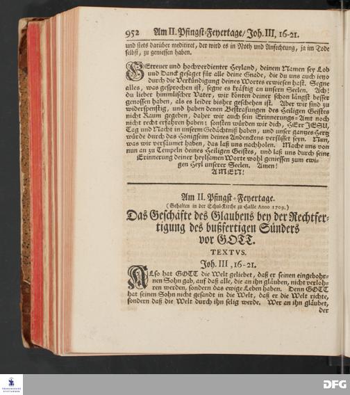 August Hermann Franckens, S.Theol.Prof.und Past. Sonn= und Fest=Tags=Predigten / Welche Theils in Halle, theils an verschiedenen auswärtigen Oertern, von wichtigen und auserlesenen Materien gehalten worden, Nebst Vorbereitung auf die hohen Feste und nützlichen Registern. Dritte Auflage. HALLE, gedruckt und verlegt im Wäysen=Hause MDCCXL. Mit Königl.Preuß.und Churfl.Brandenb.Privileg.