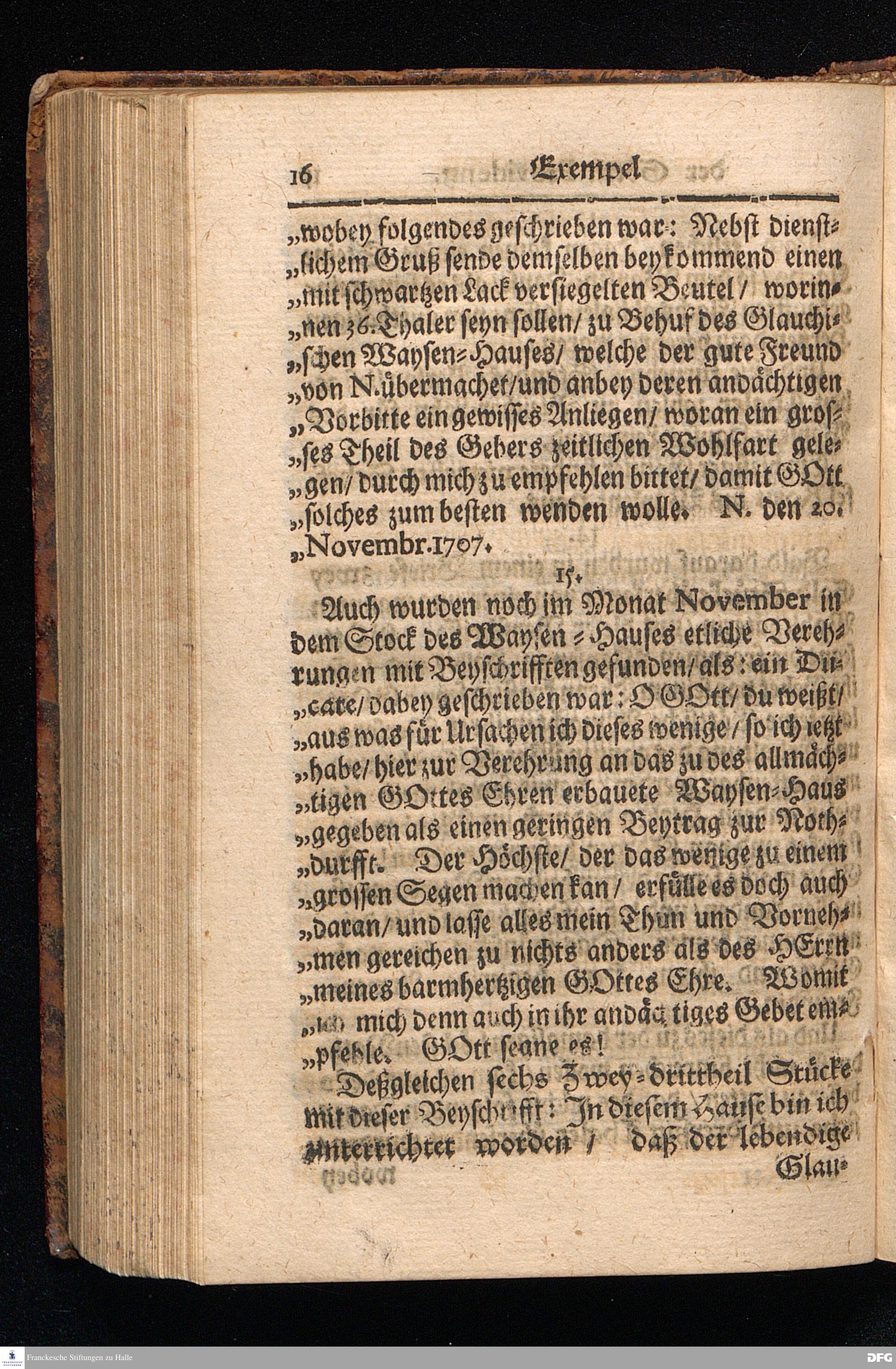 Die Fußstapfen Des noch lebenden und waltenden liebreichen und getreuen GOttes / Zur Beschämung des Unglaubens und Stärckung des Glaubens / entdecket durch eine Wahrhaffte und umständliche Nachricht von dem Wäysen=Hause und übrigen Anstalten zu Glaucha vor Halle: Welche bey gewisser Gelegenheit abgefasset / auch im Jahr 1701. zum Druck befördert / Jetzo aber Zum andernmal herausgegeben / und bis auf gegenwärtiges Jahr fortgesetzet von August Herm.Francken / SS.Theol.Prof.Publ.und Past.zu Glaucha vor Halle. Halle / in Verlegung des Waysen=Hauses MDCCVIII.