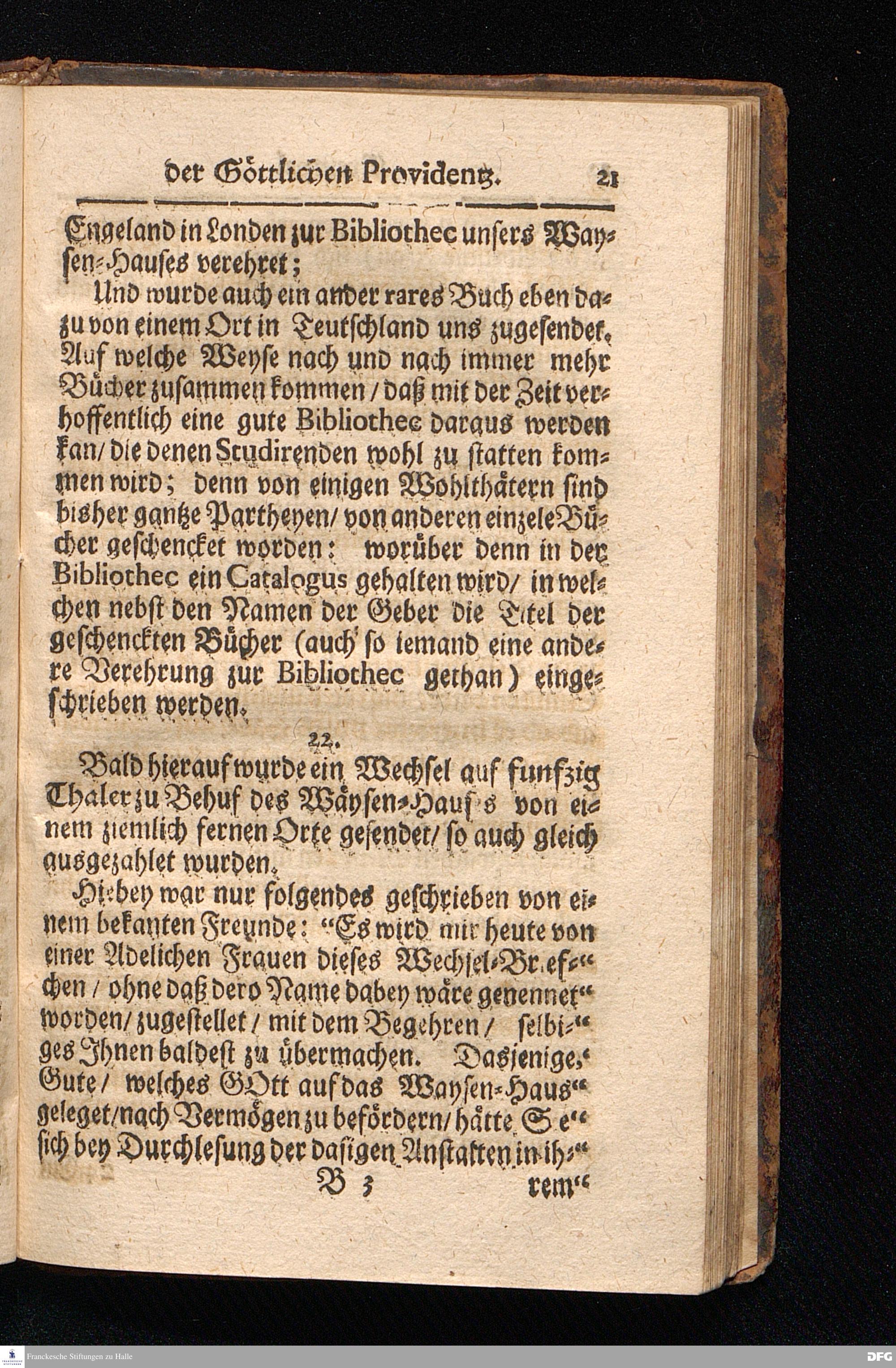 Die Fußstapfen Des noch lebenden und waltenden liebreichen und getreuen GOttes / Zur Beschämung des Unglaubens und Stärckung des Glaubens / entdecket durch eine Wahrhaffte und umständliche Nachricht von dem Wäysen=Hause und übrigen Anstalten zu Glaucha vor Halle: Welche bey gewisser Gelegenheit abgefasset / auch im Jahr 1701. zum Druck befördert / Jetzo aber Zum andernmal herausgegeben / und bis auf gegenwärtiges Jahr fortgesetzet von August Herm.Francken / SS.Theol.Prof.Publ.und Past.zu Glaucha vor Halle. Halle / in Verlegung des Waysen=Hauses MDCCVIII.
