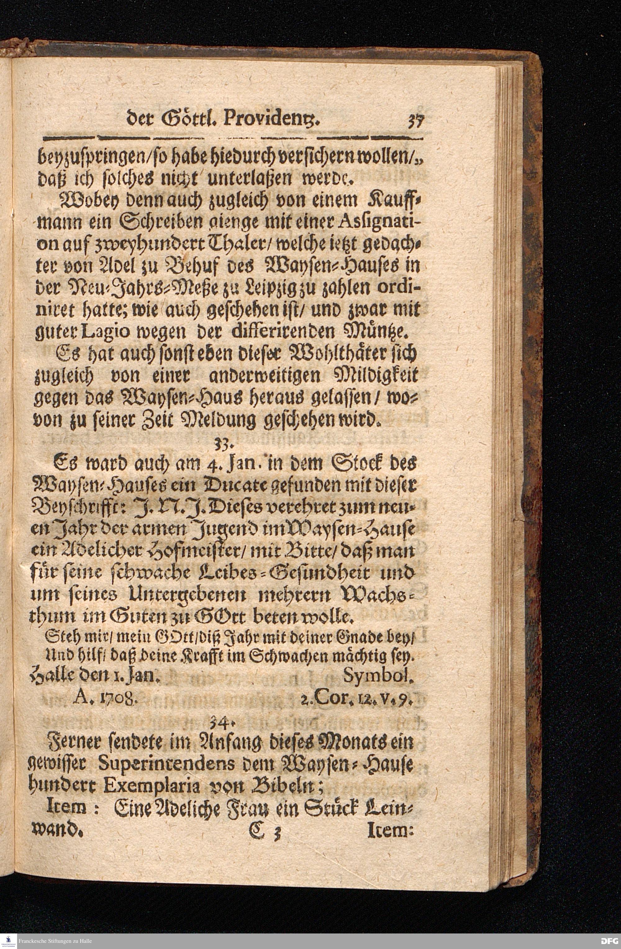 Die Fußstapfen Des noch lebenden und waltenden liebreichen und getreuen GOttes / Zur Beschämung des Unglaubens und Stärckung des Glaubens / entdecket durch eine Wahrhaffte und umständliche Nachricht von dem Wäysen=Hause und übrigen Anstalten zu Glaucha vor Halle: Welche bey gewisser Gelegenheit abgefasset / auch im Jahr 1701. zum Druck befördert / Jetzo aber Zum andernmal herausgegeben / und bis auf gegenwärtiges Jahr fortgesetzet von August Herm.Francken / SS.Theol.Prof.Publ.und Past.zu Glaucha vor Halle. Halle / in Verlegung des Waysen=Hauses MDCCVIII.