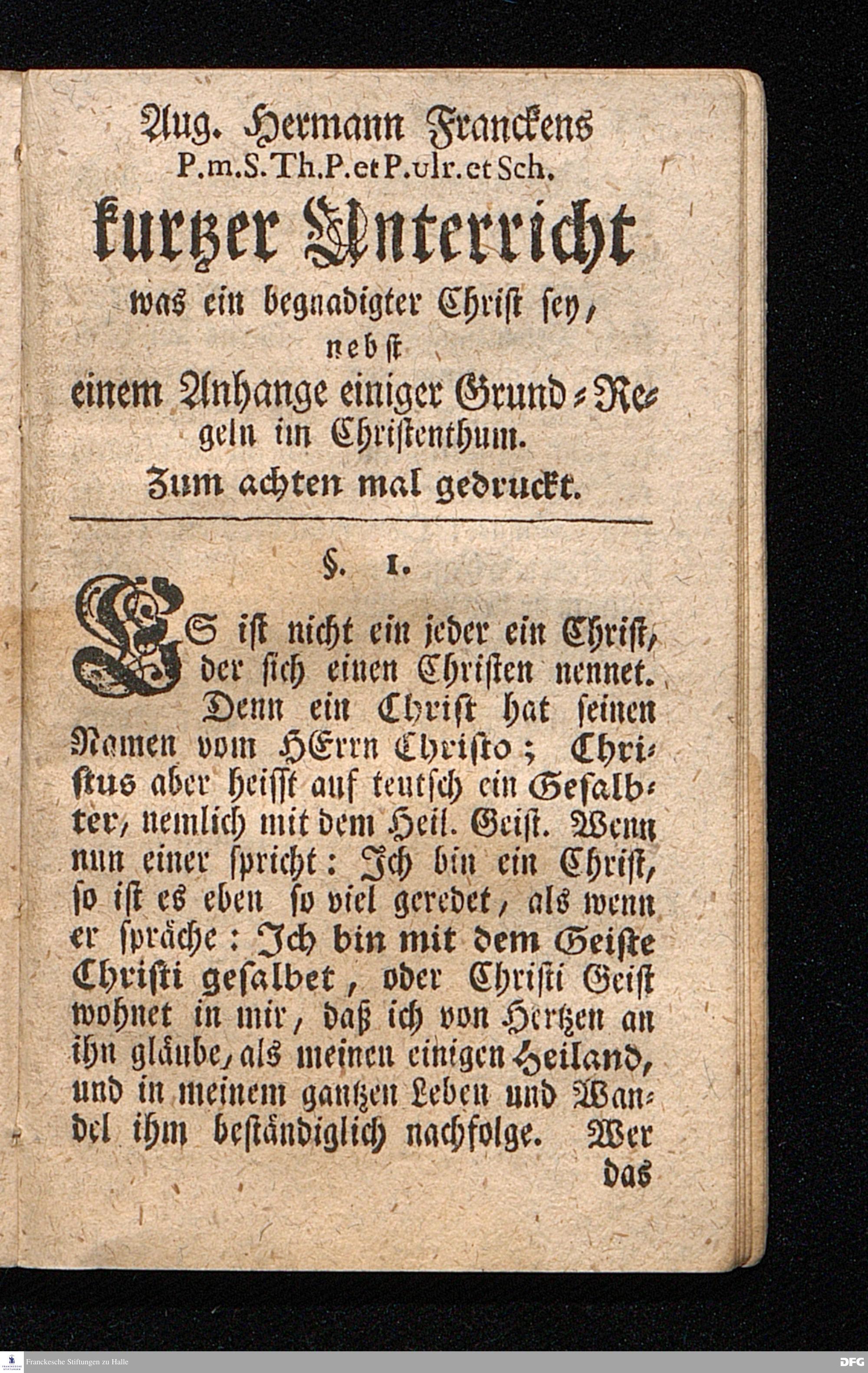 Aug. Hermann Franckens P.m.S.Th.P.et P.Ulr.et Sch. kurtzer Unterricht was ein begnadigter Christ sey, nebst einem Anhange einiger Grund=Regeln im Christenthum. Zum achten mal gedruckt. [Kopftitel]