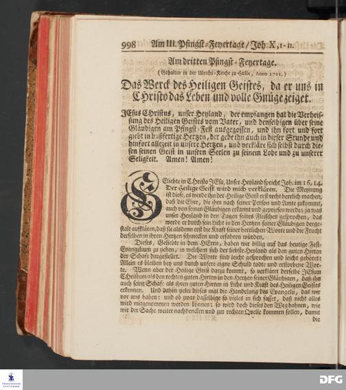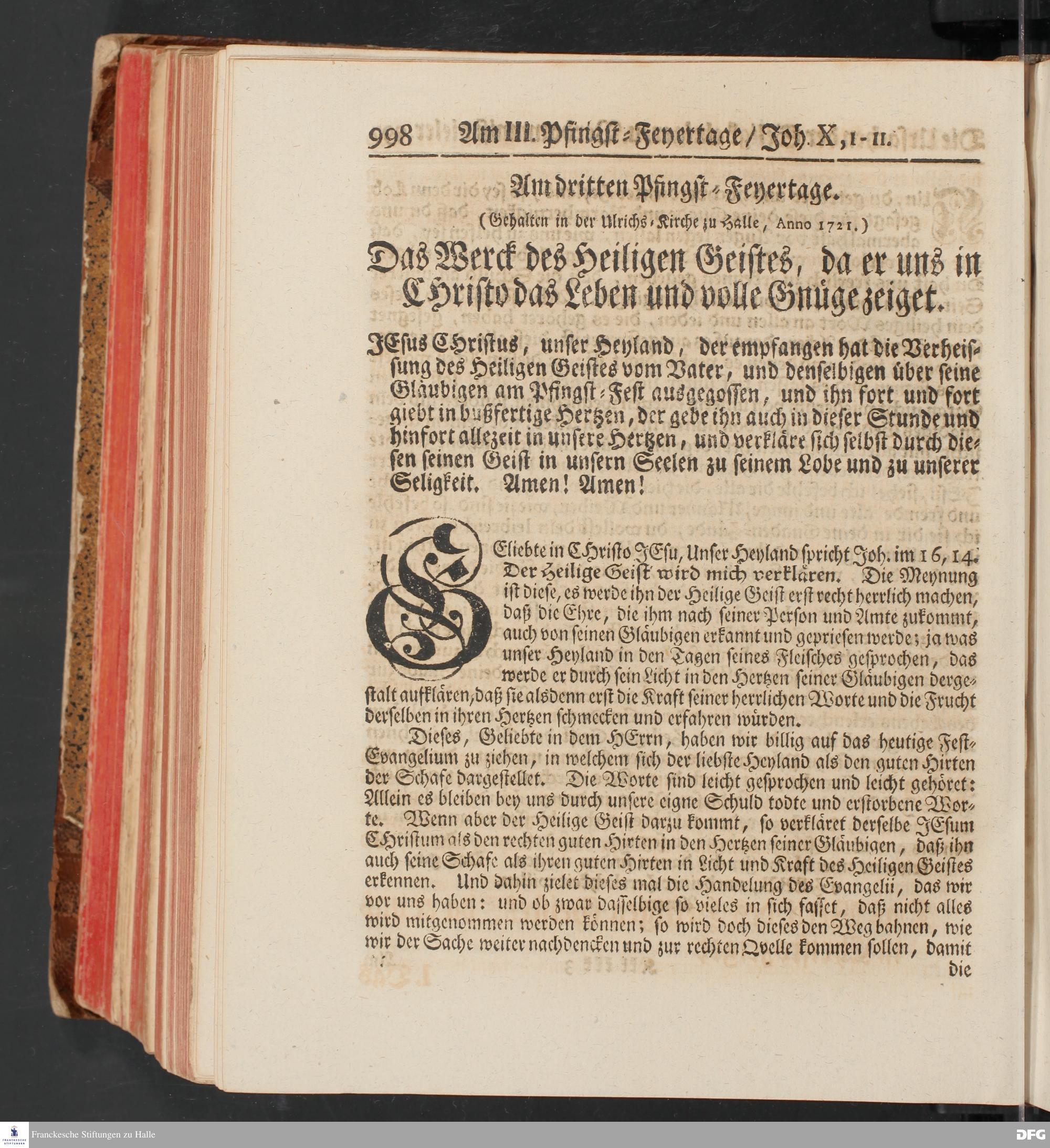 August Hermann Franckens, S.Theol.Prof.und Past. Sonn= und Fest=Tags=Predigten / Welche Theils in Halle, theils an verschiedenen auswärtigen Oertern, von wichtigen und auserlesenen Materien gehalten worden, Nebst Vorbereitung auf die hohen Feste und nützlichen Registern. Dritte Auflage. HALLE, gedruckt und verlegt im Wäysen=Hause MDCCXL. Mit Königl.Preuß.und Churfl.Brandenb.Privileg.