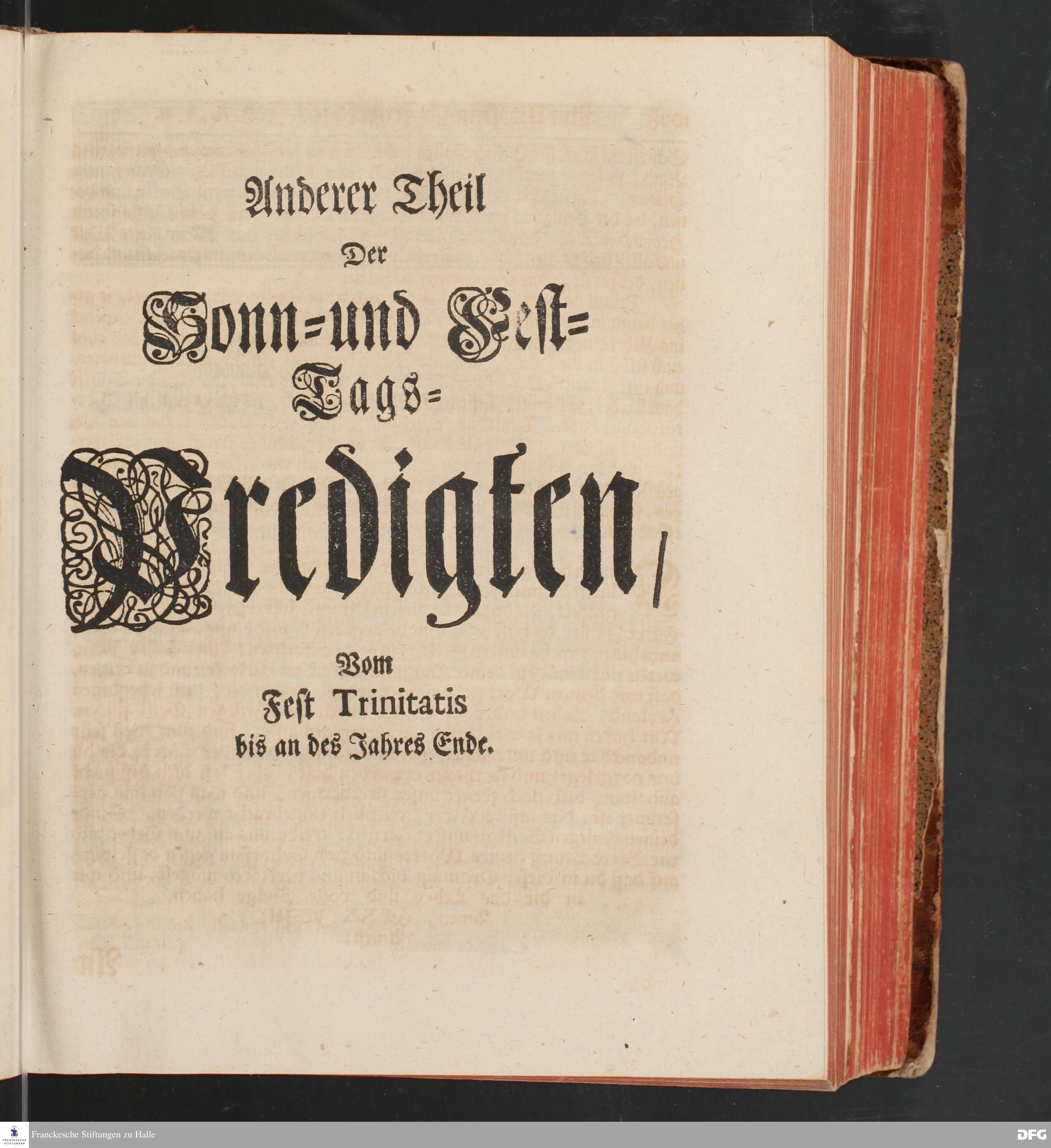 August Hermann Franckens, S.Theol.Prof.und Past. Sonn= und Fest=Tags=Predigten / Welche Theils in Halle, theils an verschiedenen auswärtigen Oertern, von wichtigen und auserlesenen Materien gehalten worden, Nebst Vorbereitung auf die hohen Feste und nützlichen Registern. Dritte Auflage. HALLE, gedruckt und verlegt im Wäysen=Hause MDCCXL. Mit Königl.Preuß.und Churfl.Brandenb.Privileg.
