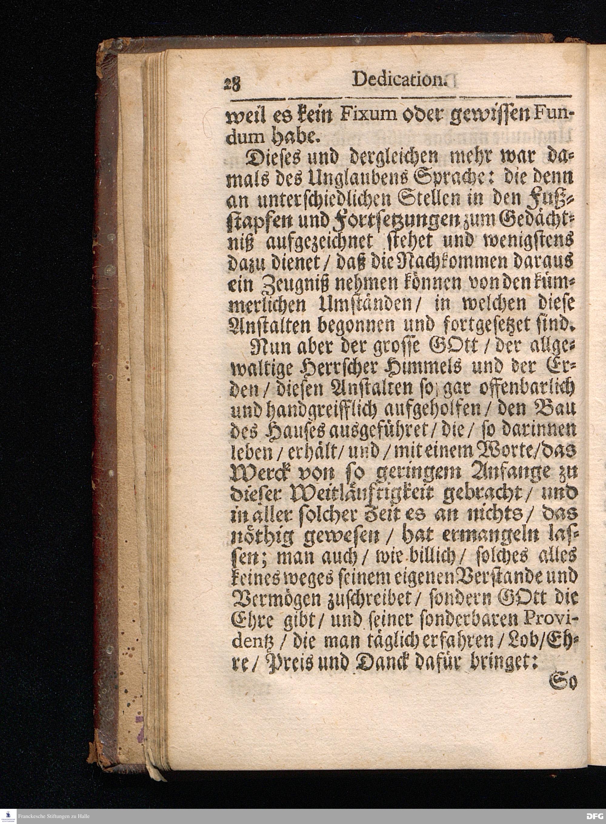 Segens=volle Fußstapfen des noch lebenden und waltenden liebreichen und getreuen GOttes / Zur Beschämung des Unglaubens und Stärckung des Glaubens entdecket durch eine wahrhafte und umständliche Nachricht von dem Wäysen=Hause und übrigen Anstalten zu Glaucha vor Halle: Welche im Jahr 1701. zum Druck befördert; ietzo aber zum dritten mal ediret / und bis auf gegenwärtiges Jahr fortgesetzet von August.Herm.Francken / S.Theol.Prof.und Past. Halle / in Verlegung des Wäysen=hauses / MDCCIX.