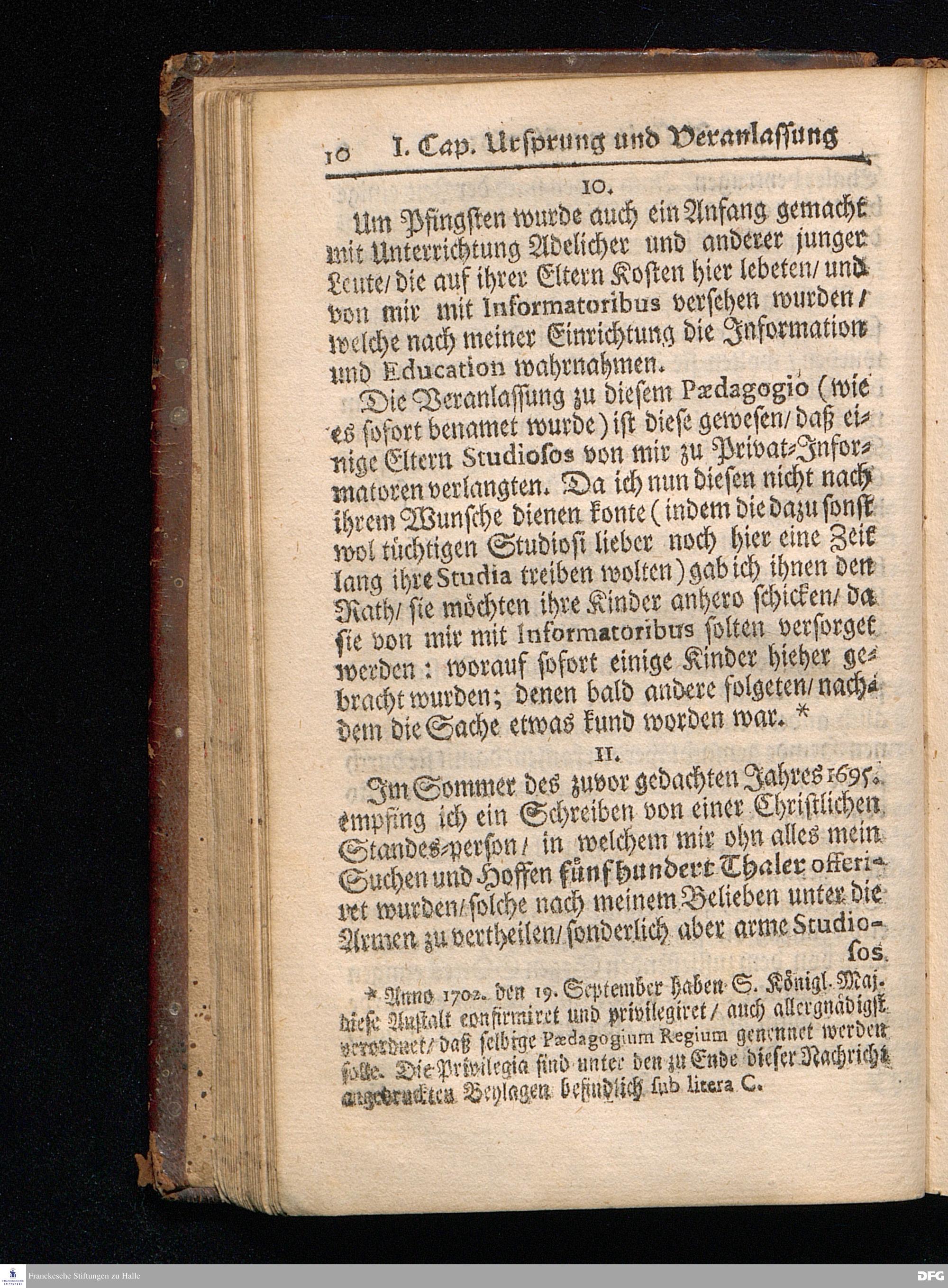 Segens=volle Fußstapfen des noch lebenden und waltenden liebreichen und getreuen GOttes / Zur Beschämung des Unglaubens und Stärckung des Glaubens entdecket durch eine wahrhafte und umständliche Nachricht von dem Wäysen=Hause und übrigen Anstalten zu Glaucha vor Halle: Welche im Jahr 1701. zum Druck befördert; ietzo aber zum dritten mal ediret / und bis auf gegenwärtiges Jahr fortgesetzet von August.Herm.Francken / S.Theol.Prof.und Past. Halle / in Verlegung des Wäysen=hauses / MDCCIX.