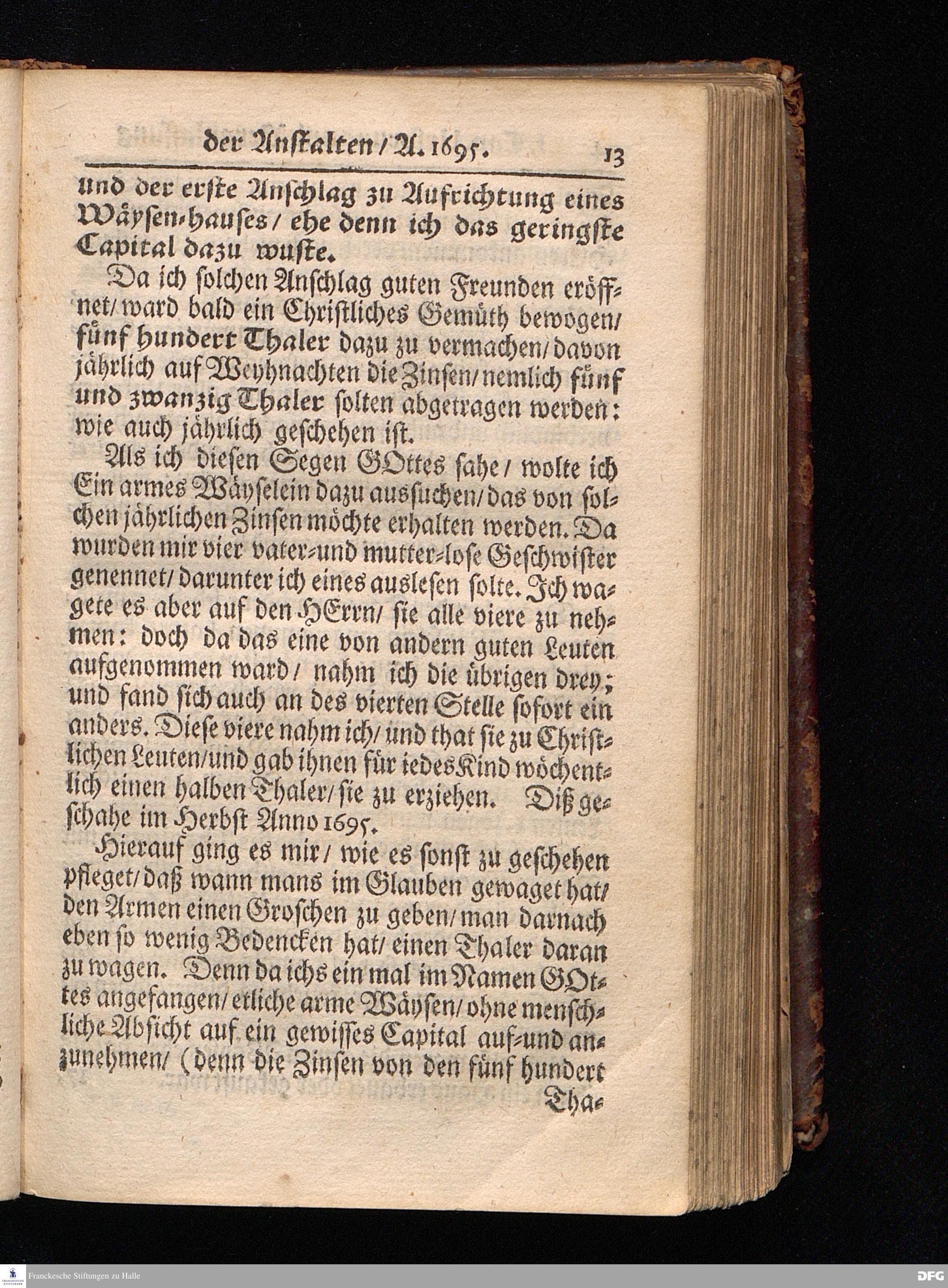 Segens=volle Fußstapfen des noch lebenden und waltenden liebreichen und getreuen GOttes / Zur Beschämung des Unglaubens und Stärckung des Glaubens entdecket durch eine wahrhafte und umständliche Nachricht von dem Wäysen=Hause und übrigen Anstalten zu Glaucha vor Halle: Welche im Jahr 1701. zum Druck befördert; ietzo aber zum dritten mal ediret / und bis auf gegenwärtiges Jahr fortgesetzet von August.Herm.Francken / S.Theol.Prof.und Past. Halle / in Verlegung des Wäysen=hauses / MDCCIX.