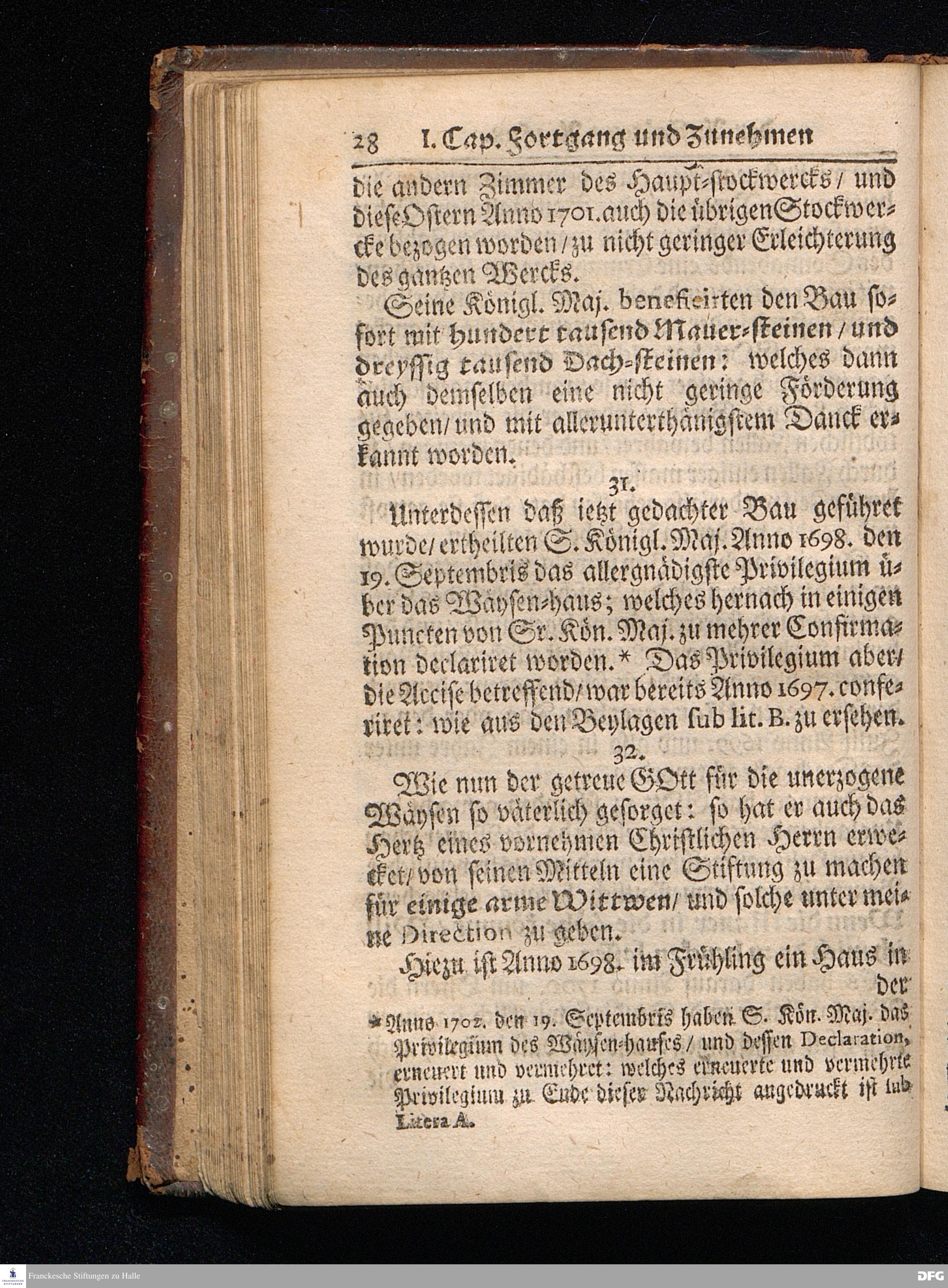Segens=volle Fußstapfen des noch lebenden und waltenden liebreichen und getreuen GOttes / Zur Beschämung des Unglaubens und Stärckung des Glaubens entdecket durch eine wahrhafte und umständliche Nachricht von dem Wäysen=Hause und übrigen Anstalten zu Glaucha vor Halle: Welche im Jahr 1701. zum Druck befördert; ietzo aber zum dritten mal ediret / und bis auf gegenwärtiges Jahr fortgesetzet von August.Herm.Francken / S.Theol.Prof.und Past. Halle / in Verlegung des Wäysen=hauses / MDCCIX.