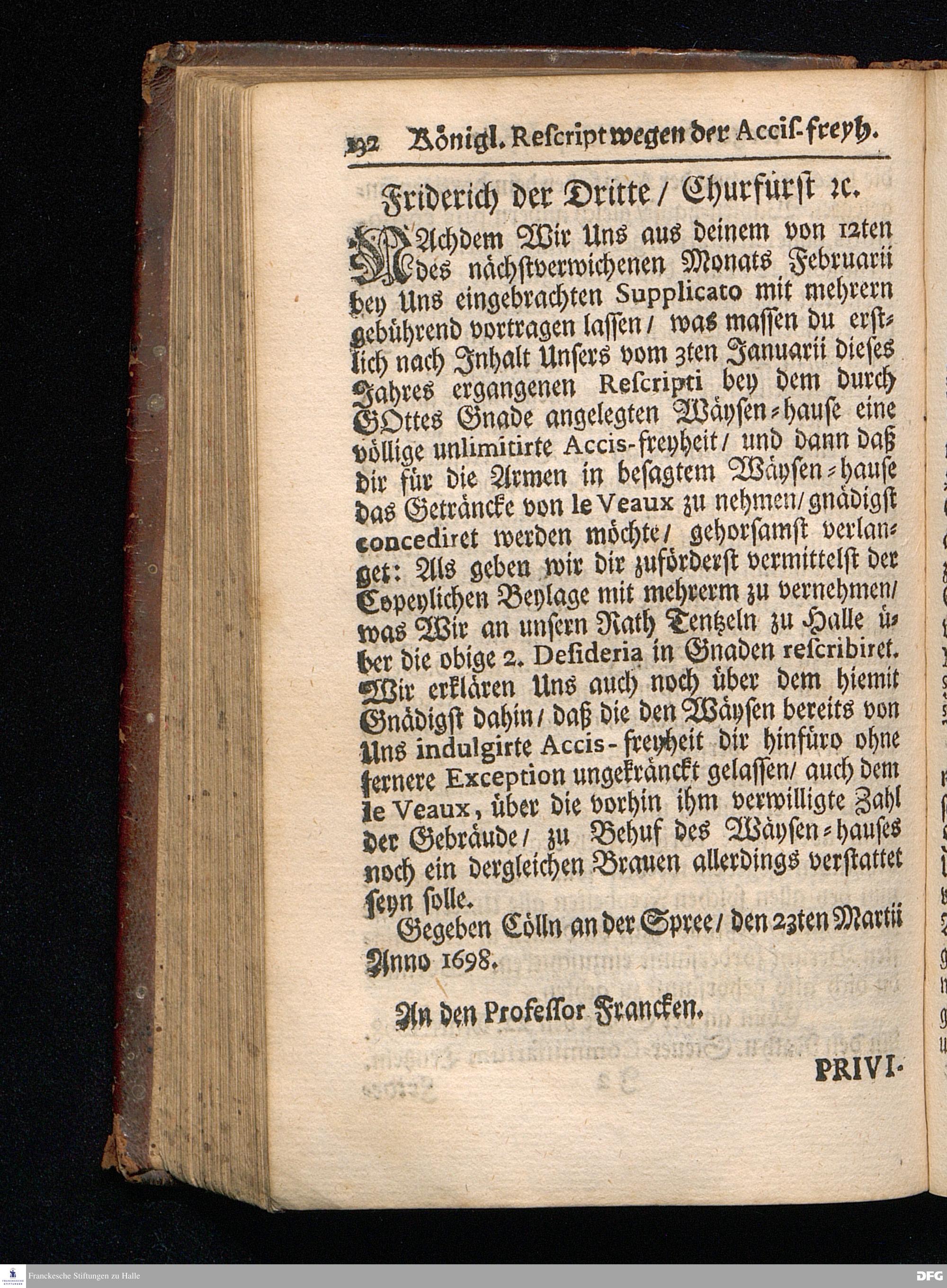 Segens=volle Fußstapfen des noch lebenden und waltenden liebreichen und getreuen GOttes / Zur Beschämung des Unglaubens und Stärckung des Glaubens entdecket durch eine wahrhafte und umständliche Nachricht von dem Wäysen=Hause und übrigen Anstalten zu Glaucha vor Halle: Welche im Jahr 1701. zum Druck befördert; ietzo aber zum dritten mal ediret / und bis auf gegenwärtiges Jahr fortgesetzet von August.Herm.Francken / S.Theol.Prof.und Past. Halle / in Verlegung des Wäysen=hauses / MDCCIX.