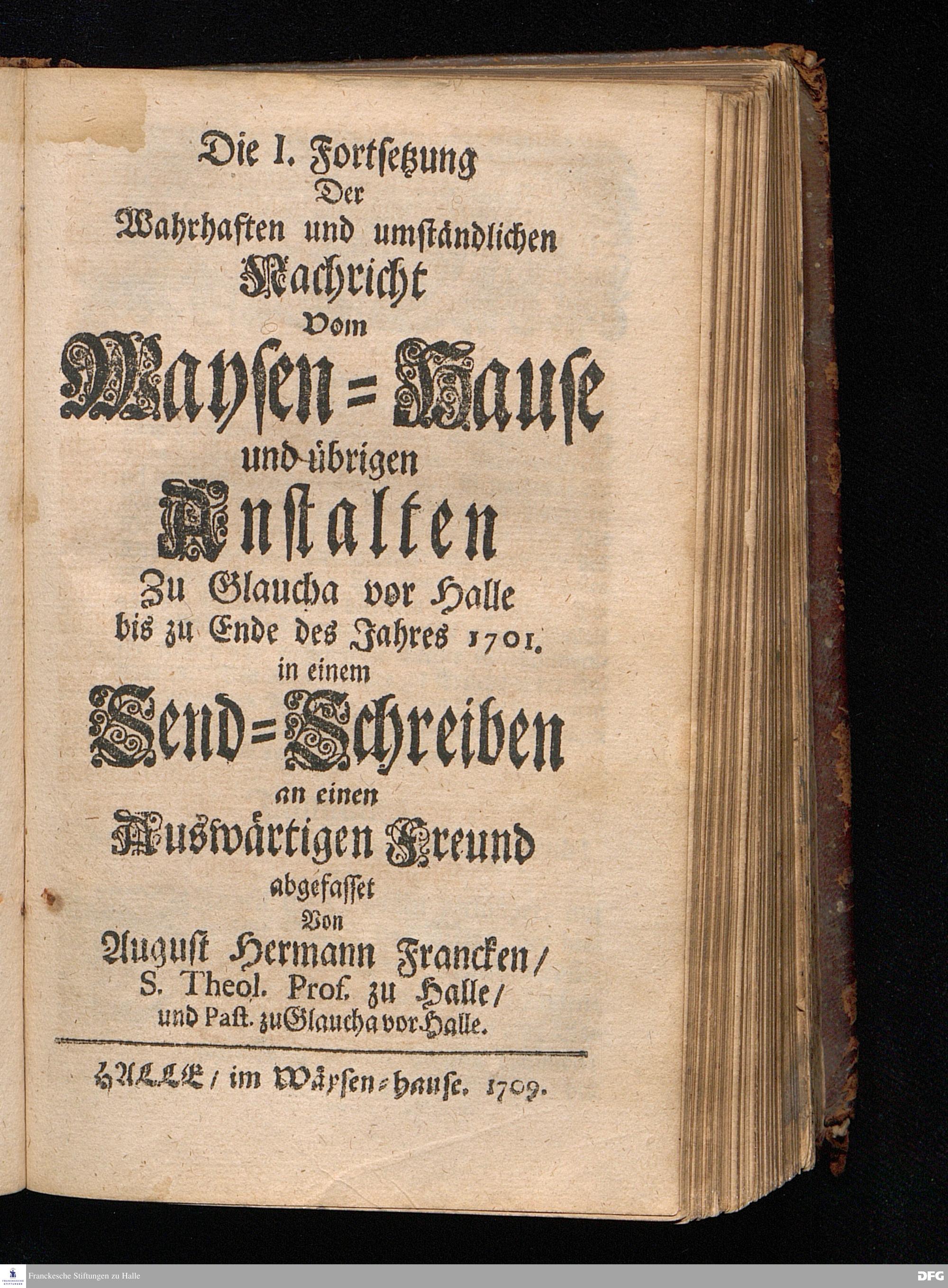 Segens=volle Fußstapfen des noch lebenden und waltenden liebreichen und getreuen GOttes / Zur Beschämung des Unglaubens und Stärckung des Glaubens entdecket durch eine wahrhafte und umständliche Nachricht von dem Wäysen=Hause und übrigen Anstalten zu Glaucha vor Halle: Welche im Jahr 1701. zum Druck befördert; ietzo aber zum dritten mal ediret / und bis auf gegenwärtiges Jahr fortgesetzet von August.Herm.Francken / S.Theol.Prof.und Past. Halle / in Verlegung des Wäysen=hauses / MDCCIX.