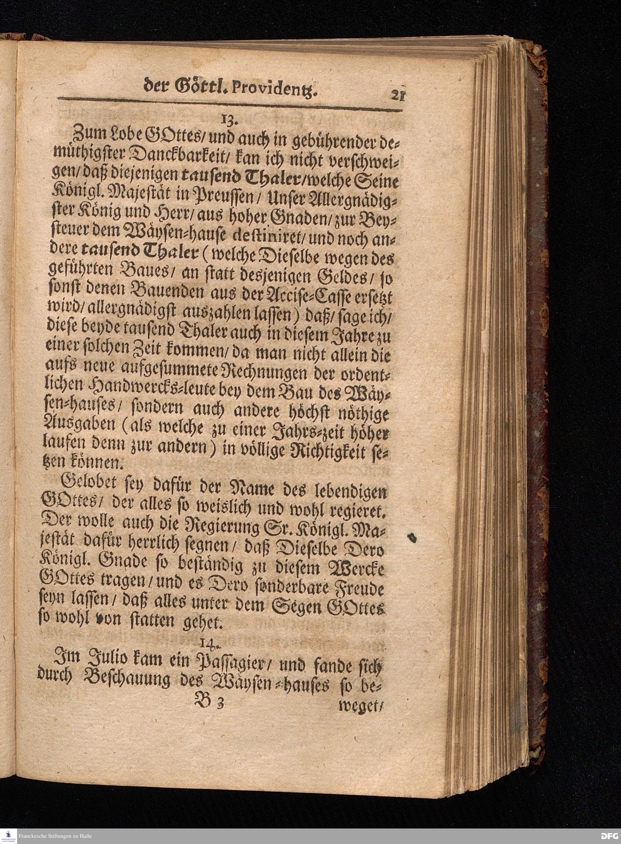 Segens=volle Fußstapfen des noch lebenden und waltenden liebreichen und getreuen GOttes / Zur Beschämung des Unglaubens und Stärckung des Glaubens entdecket durch eine wahrhafte und umständliche Nachricht von dem Wäysen=Hause und übrigen Anstalten zu Glaucha vor Halle: Welche im Jahr 1701. zum Druck befördert; ietzo aber zum dritten mal ediret / und bis auf gegenwärtiges Jahr fortgesetzet von August.Herm.Francken / S.Theol.Prof.und Past. Halle / in Verlegung des Wäysen=hauses / MDCCIX.