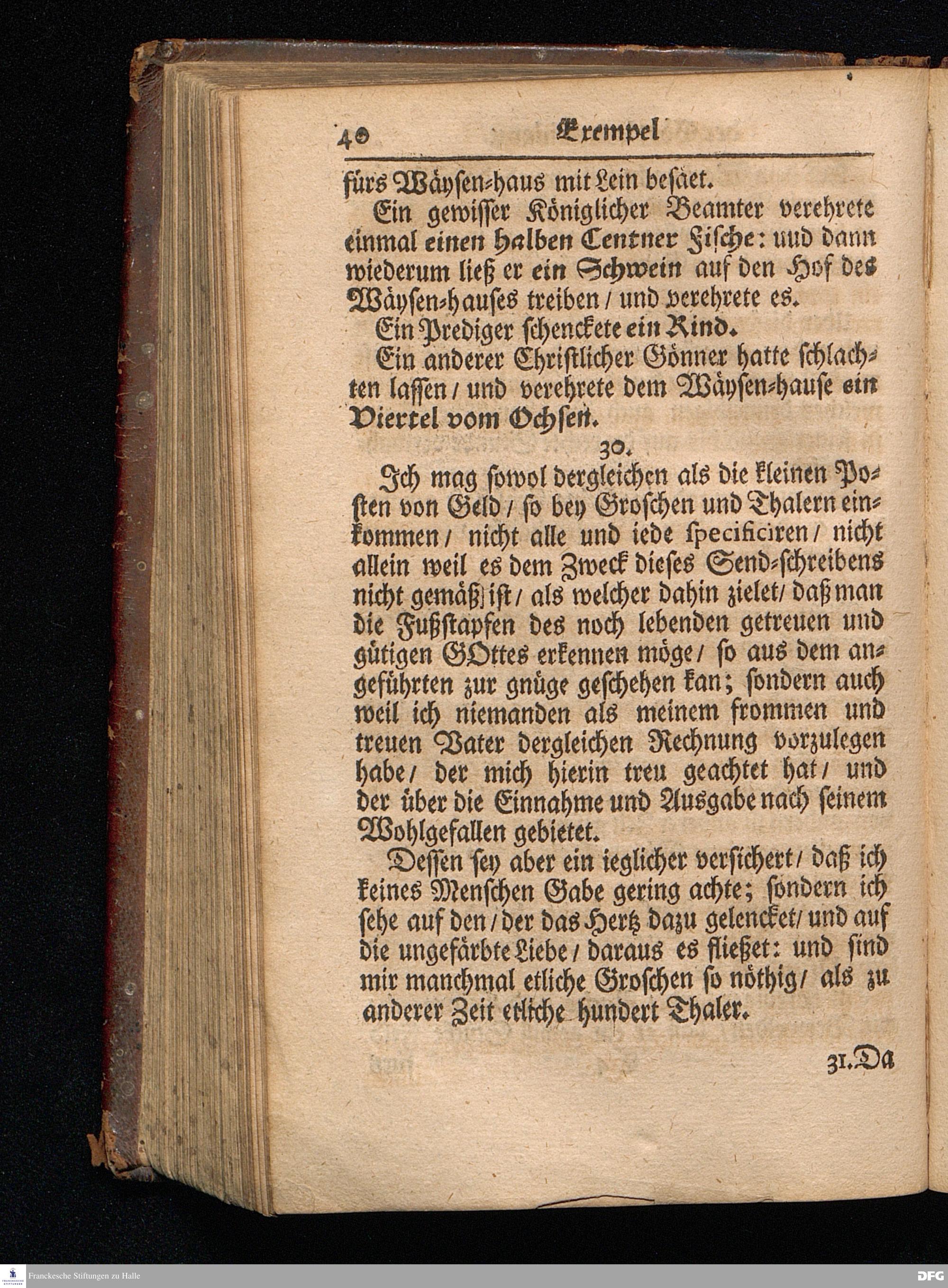 Segens=volle Fußstapfen des noch lebenden und waltenden liebreichen und getreuen GOttes / Zur Beschämung des Unglaubens und Stärckung des Glaubens entdecket durch eine wahrhafte und umständliche Nachricht von dem Wäysen=Hause und übrigen Anstalten zu Glaucha vor Halle: Welche im Jahr 1701. zum Druck befördert; ietzo aber zum dritten mal ediret / und bis auf gegenwärtiges Jahr fortgesetzet von August.Herm.Francken / S.Theol.Prof.und Past. Halle / in Verlegung des Wäysen=hauses / MDCCIX.