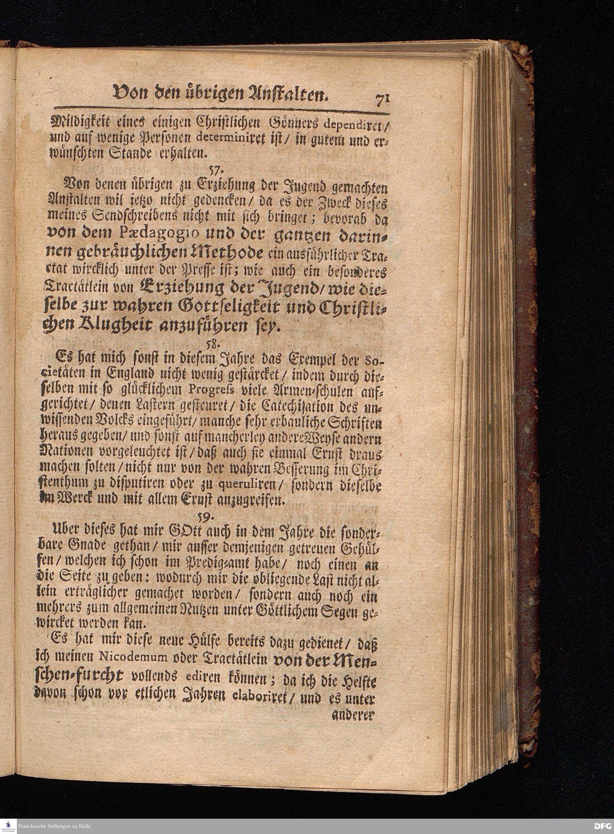 Segens=volle Fußstapfen des noch lebenden und waltenden liebreichen und getreuen GOttes / Zur Beschämung des Unglaubens und Stärckung des Glaubens entdecket durch eine wahrhafte und umständliche Nachricht von dem Wäysen=Hause und übrigen Anstalten zu Glaucha vor Halle: Welche im Jahr 1701. zum Druck befördert; ietzo aber zum dritten mal ediret / und bis auf gegenwärtiges Jahr fortgesetzet von August.Herm.Francken / S.Theol.Prof.und Past. Halle / in Verlegung des Wäysen=hauses / MDCCIX.