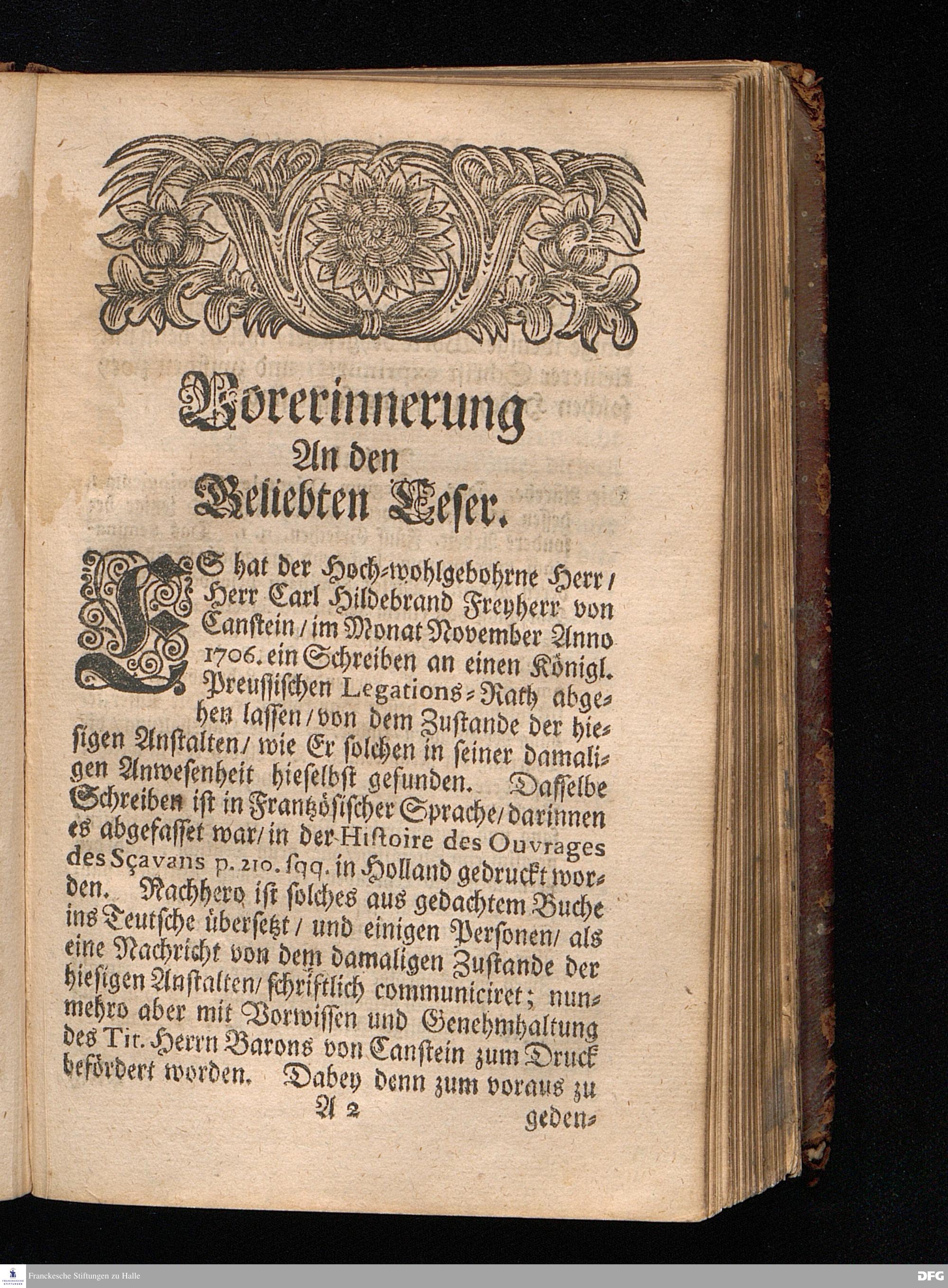 Segens=volle Fußstapfen des noch lebenden und waltenden liebreichen und getreuen GOttes / Zur Beschämung des Unglaubens und Stärckung des Glaubens entdecket durch eine wahrhafte und umständliche Nachricht von dem Wäysen=Hause und übrigen Anstalten zu Glaucha vor Halle: Welche im Jahr 1701. zum Druck befördert; ietzo aber zum dritten mal ediret / und bis auf gegenwärtiges Jahr fortgesetzet von August.Herm.Francken / S.Theol.Prof.und Past. Halle / in Verlegung des Wäysen=hauses / MDCCIX.