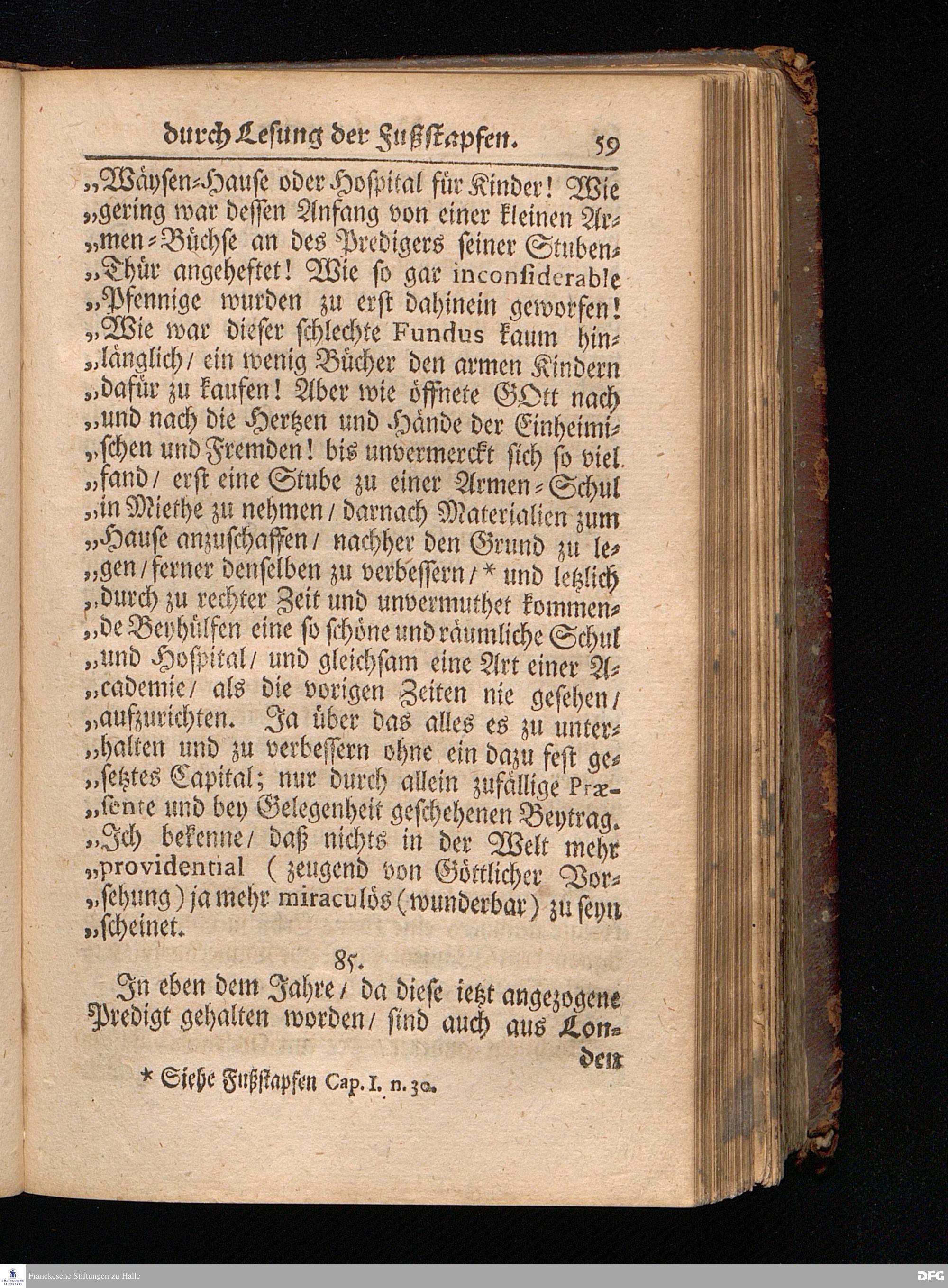 Segens=volle Fußstapfen des noch lebenden und waltenden liebreichen und getreuen GOttes / Zur Beschämung des Unglaubens und Stärckung des Glaubens entdecket durch eine wahrhafte und umständliche Nachricht von dem Wäysen=Hause und übrigen Anstalten zu Glaucha vor Halle: Welche im Jahr 1701. zum Druck befördert; ietzo aber zum dritten mal ediret / und bis auf gegenwärtiges Jahr fortgesetzet von August.Herm.Francken / S.Theol.Prof.und Past. Halle / in Verlegung des Wäysen=hauses / MDCCIX.