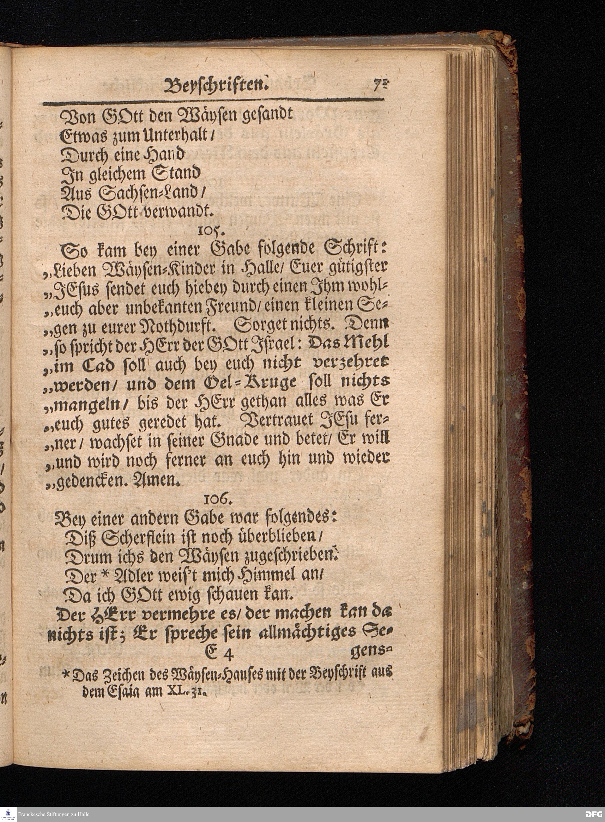 Segens=volle Fußstapfen des noch lebenden und waltenden liebreichen und getreuen GOttes / Zur Beschämung des Unglaubens und Stärckung des Glaubens entdecket durch eine wahrhafte und umständliche Nachricht von dem Wäysen=Hause und übrigen Anstalten zu Glaucha vor Halle: Welche im Jahr 1701. zum Druck befördert; ietzo aber zum dritten mal ediret / und bis auf gegenwärtiges Jahr fortgesetzet von August.Herm.Francken / S.Theol.Prof.und Past. Halle / in Verlegung des Wäysen=hauses / MDCCIX.