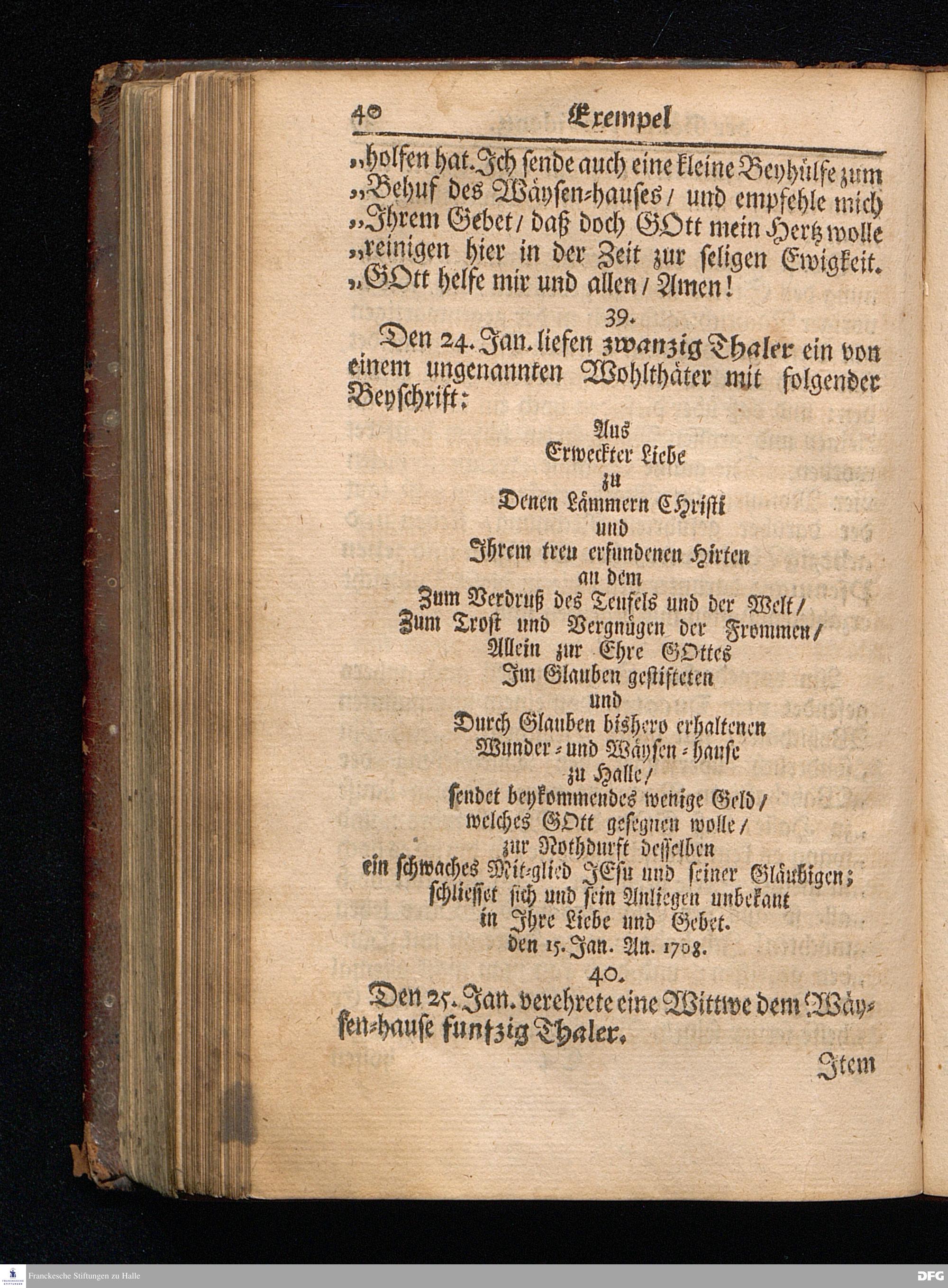 Segens=volle Fußstapfen des noch lebenden und waltenden liebreichen und getreuen GOttes / Zur Beschämung des Unglaubens und Stärckung des Glaubens entdecket durch eine wahrhafte und umständliche Nachricht von dem Wäysen=Hause und übrigen Anstalten zu Glaucha vor Halle: Welche im Jahr 1701. zum Druck befördert; ietzo aber zum dritten mal ediret / und bis auf gegenwärtiges Jahr fortgesetzet von August.Herm.Francken / S.Theol.Prof.und Past. Halle / in Verlegung des Wäysen=hauses / MDCCIX.
