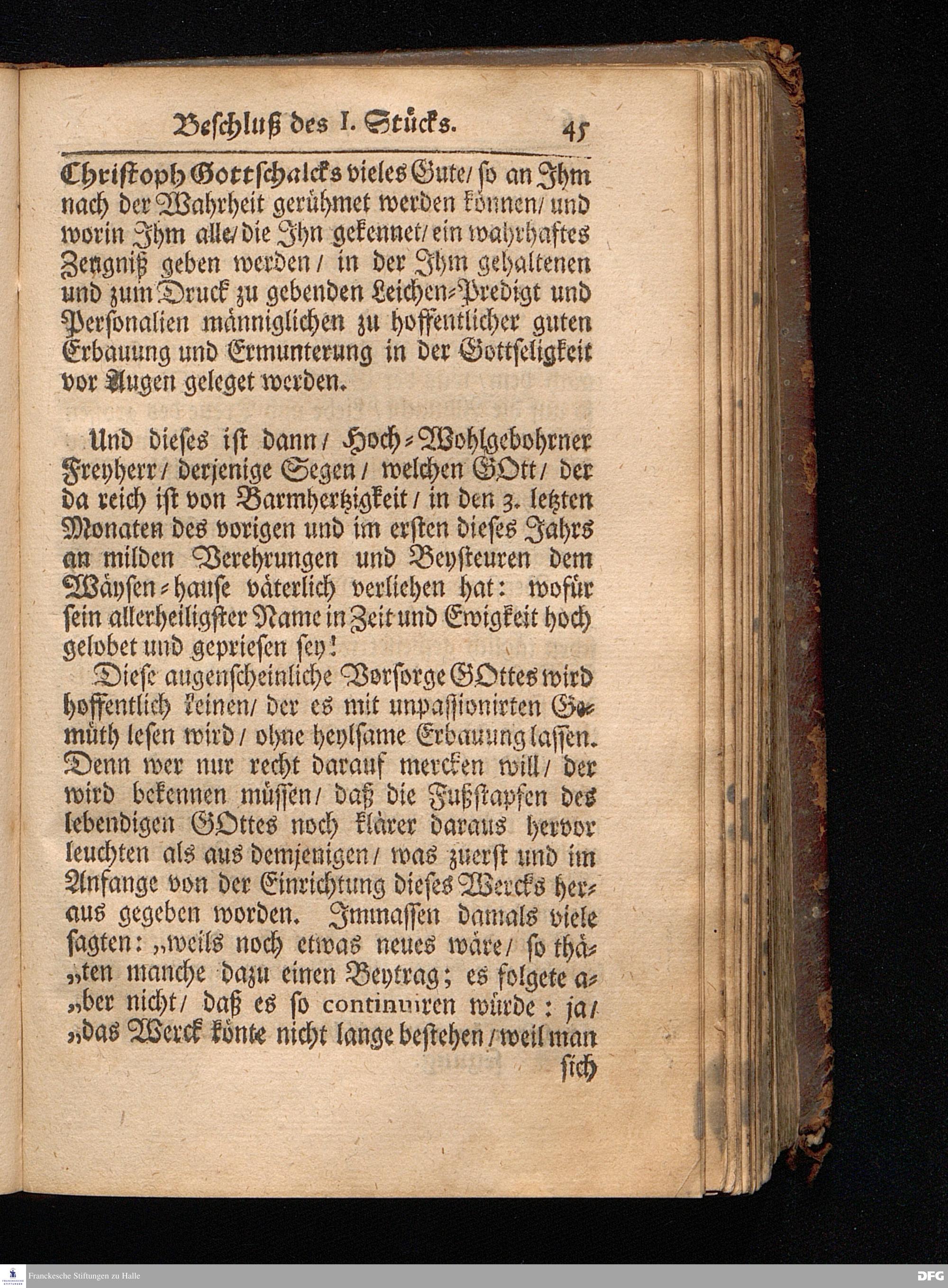 Segens=volle Fußstapfen des noch lebenden und waltenden liebreichen und getreuen GOttes / Zur Beschämung des Unglaubens und Stärckung des Glaubens entdecket durch eine wahrhafte und umständliche Nachricht von dem Wäysen=Hause und übrigen Anstalten zu Glaucha vor Halle: Welche im Jahr 1701. zum Druck befördert; ietzo aber zum dritten mal ediret / und bis auf gegenwärtiges Jahr fortgesetzet von August.Herm.Francken / S.Theol.Prof.und Past. Halle / in Verlegung des Wäysen=hauses / MDCCIX.