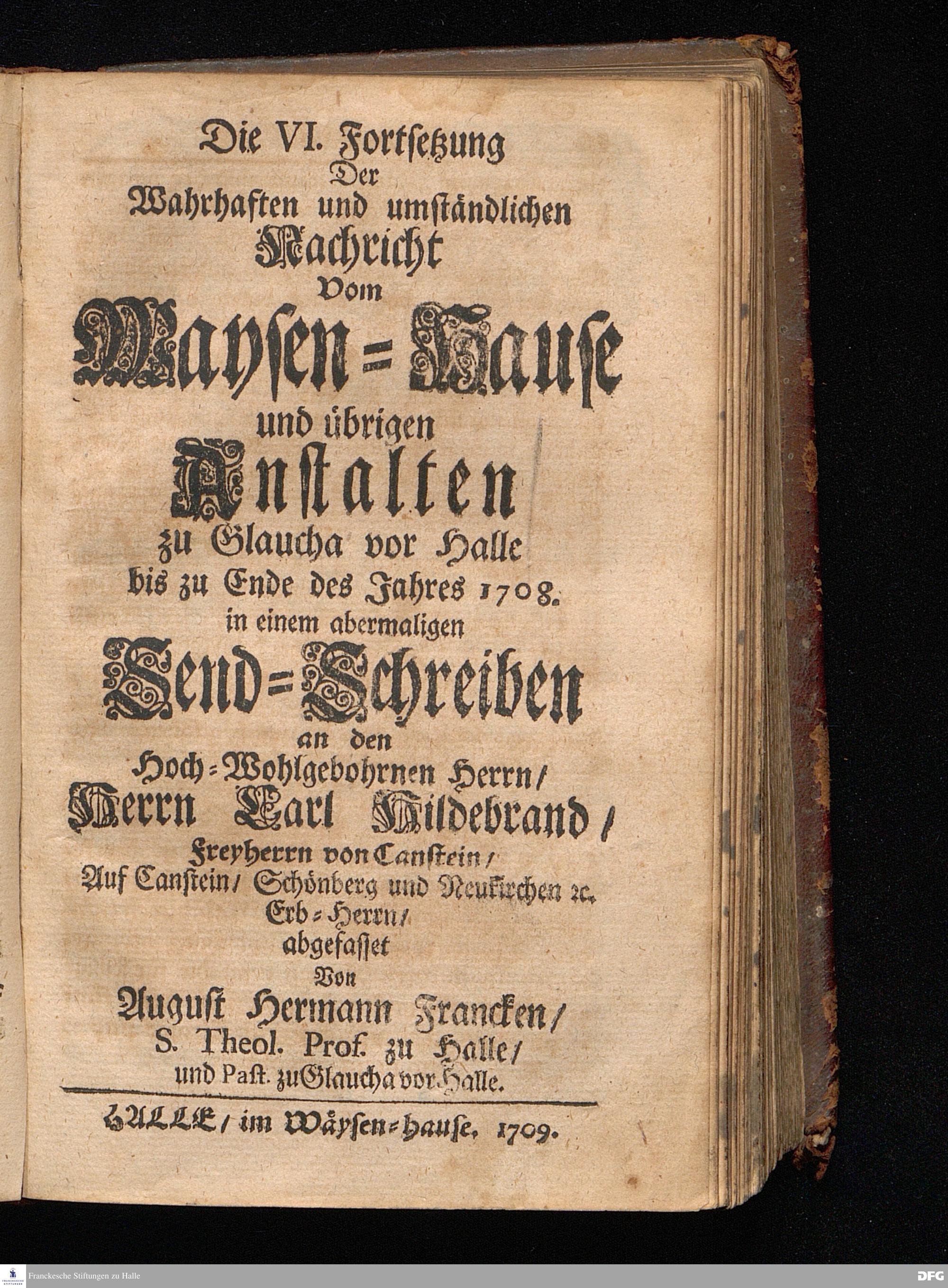 Segens=volle Fußstapfen des noch lebenden und waltenden liebreichen und getreuen GOttes / Zur Beschämung des Unglaubens und Stärckung des Glaubens entdecket durch eine wahrhafte und umständliche Nachricht von dem Wäysen=Hause und übrigen Anstalten zu Glaucha vor Halle: Welche im Jahr 1701. zum Druck befördert; ietzo aber zum dritten mal ediret / und bis auf gegenwärtiges Jahr fortgesetzet von August.Herm.Francken / S.Theol.Prof.und Past. Halle / in Verlegung des Wäysen=hauses / MDCCIX.