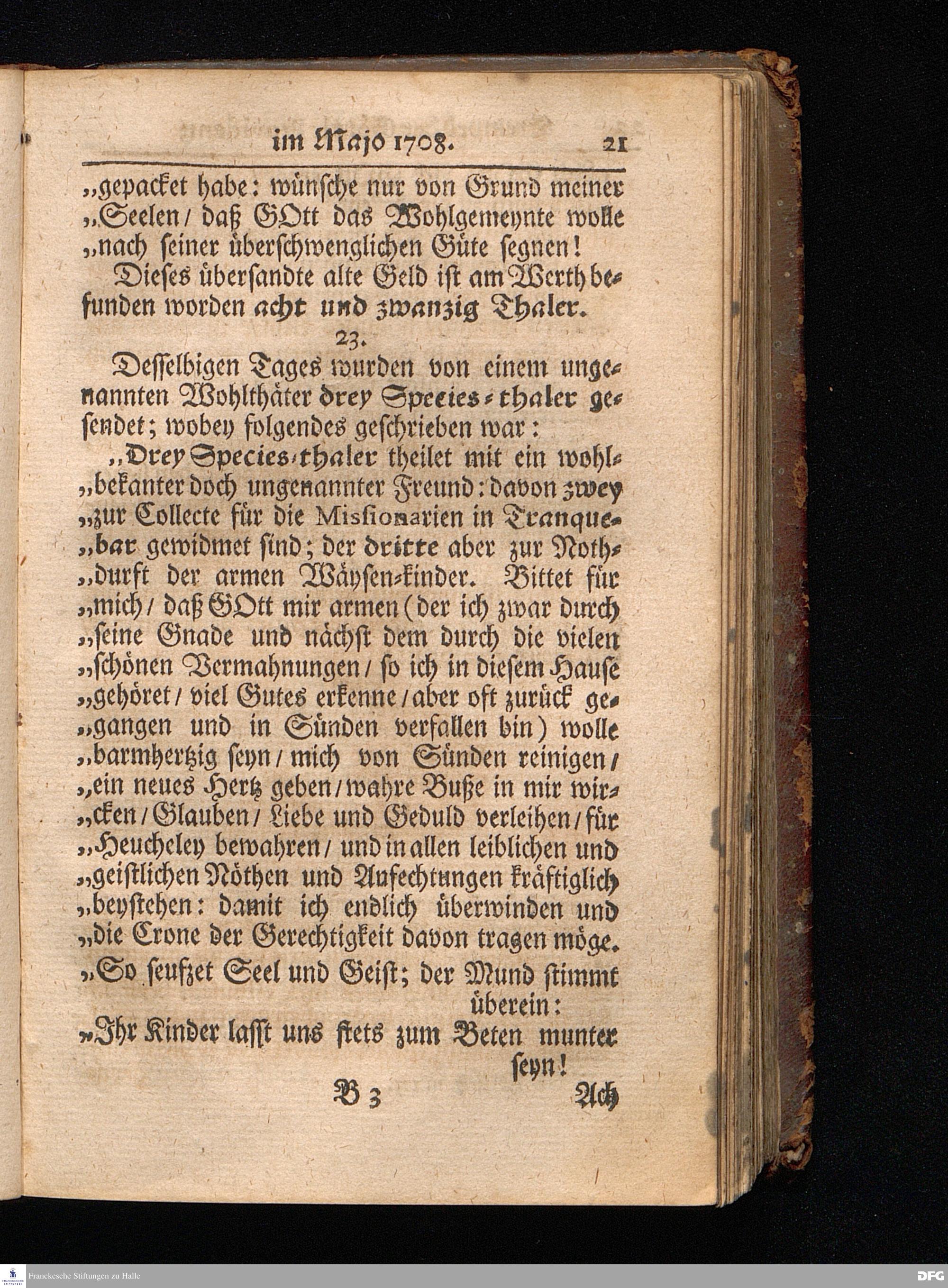 Segens=volle Fußstapfen des noch lebenden und waltenden liebreichen und getreuen GOttes / Zur Beschämung des Unglaubens und Stärckung des Glaubens entdecket durch eine wahrhafte und umständliche Nachricht von dem Wäysen=Hause und übrigen Anstalten zu Glaucha vor Halle: Welche im Jahr 1701. zum Druck befördert; ietzo aber zum dritten mal ediret / und bis auf gegenwärtiges Jahr fortgesetzet von August.Herm.Francken / S.Theol.Prof.und Past. Halle / in Verlegung des Wäysen=hauses / MDCCIX.