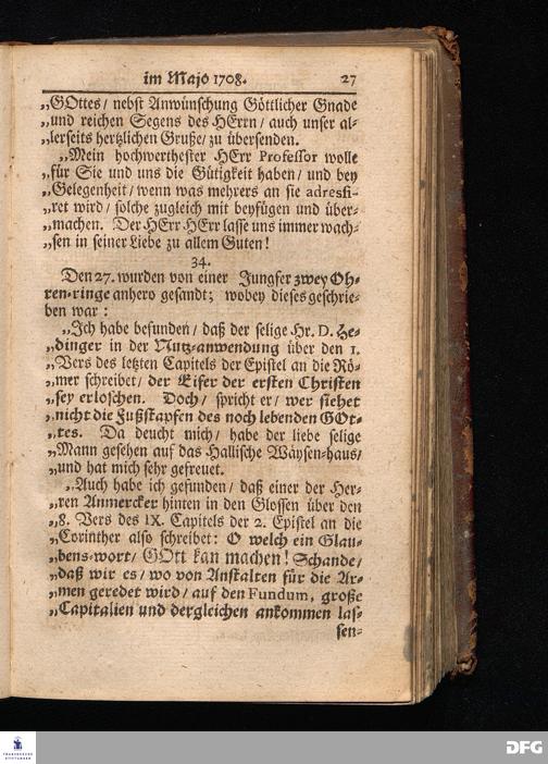 Segens=volle Fußstapfen des noch lebenden und waltenden liebreichen und getreuen GOttes / Zur Beschämung des Unglaubens und Stärckung des Glaubens entdecket durch eine wahrhafte und umständliche Nachricht von dem Wäysen=Hause und übrigen Anstalten zu Glaucha vor Halle: Welche im Jahr 1701. zum Druck befördert; ietzo aber zum dritten mal ediret / und bis auf gegenwärtiges Jahr fortgesetzet von August.Herm.Francken / S.Theol.Prof.und Past. Halle / in Verlegung des Wäysen=hauses / MDCCIX.