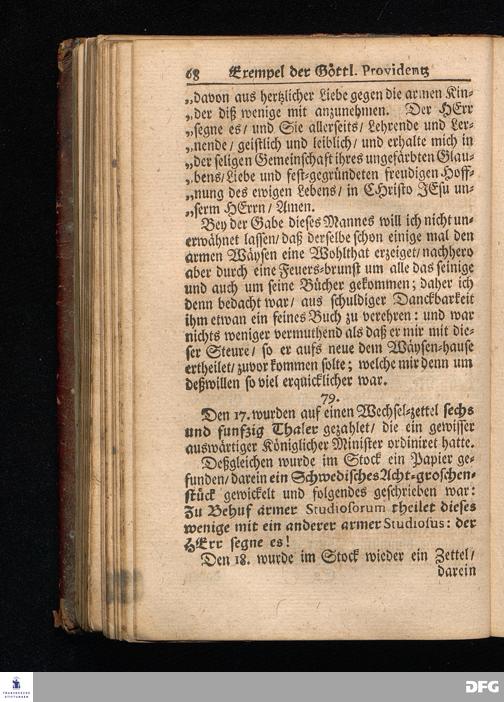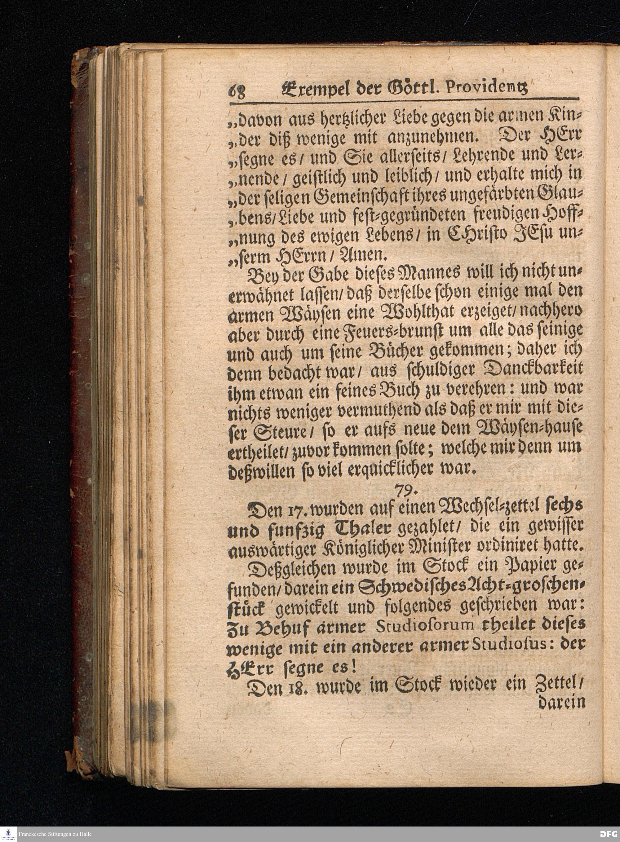 Segens=volle Fußstapfen des noch lebenden und waltenden liebreichen und getreuen GOttes / Zur Beschämung des Unglaubens und Stärckung des Glaubens entdecket durch eine wahrhafte und umständliche Nachricht von dem Wäysen=Hause und übrigen Anstalten zu Glaucha vor Halle: Welche im Jahr 1701. zum Druck befördert; ietzo aber zum dritten mal ediret / und bis auf gegenwärtiges Jahr fortgesetzet von August.Herm.Francken / S.Theol.Prof.und Past. Halle / in Verlegung des Wäysen=hauses / MDCCIX.