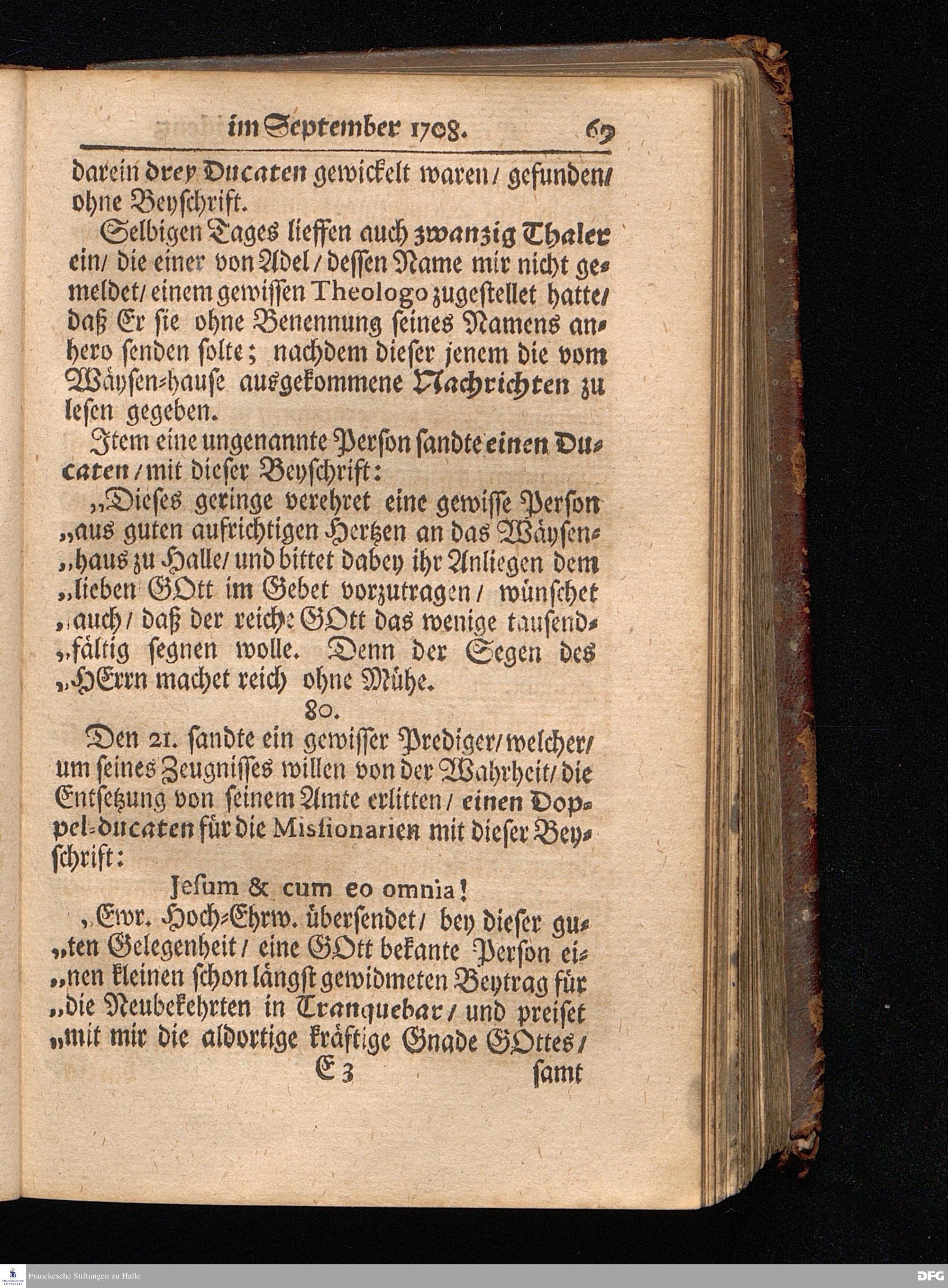 Segens=volle Fußstapfen des noch lebenden und waltenden liebreichen und getreuen GOttes / Zur Beschämung des Unglaubens und Stärckung des Glaubens entdecket durch eine wahrhafte und umständliche Nachricht von dem Wäysen=Hause und übrigen Anstalten zu Glaucha vor Halle: Welche im Jahr 1701. zum Druck befördert; ietzo aber zum dritten mal ediret / und bis auf gegenwärtiges Jahr fortgesetzet von August.Herm.Francken / S.Theol.Prof.und Past. Halle / in Verlegung des Wäysen=hauses / MDCCIX.