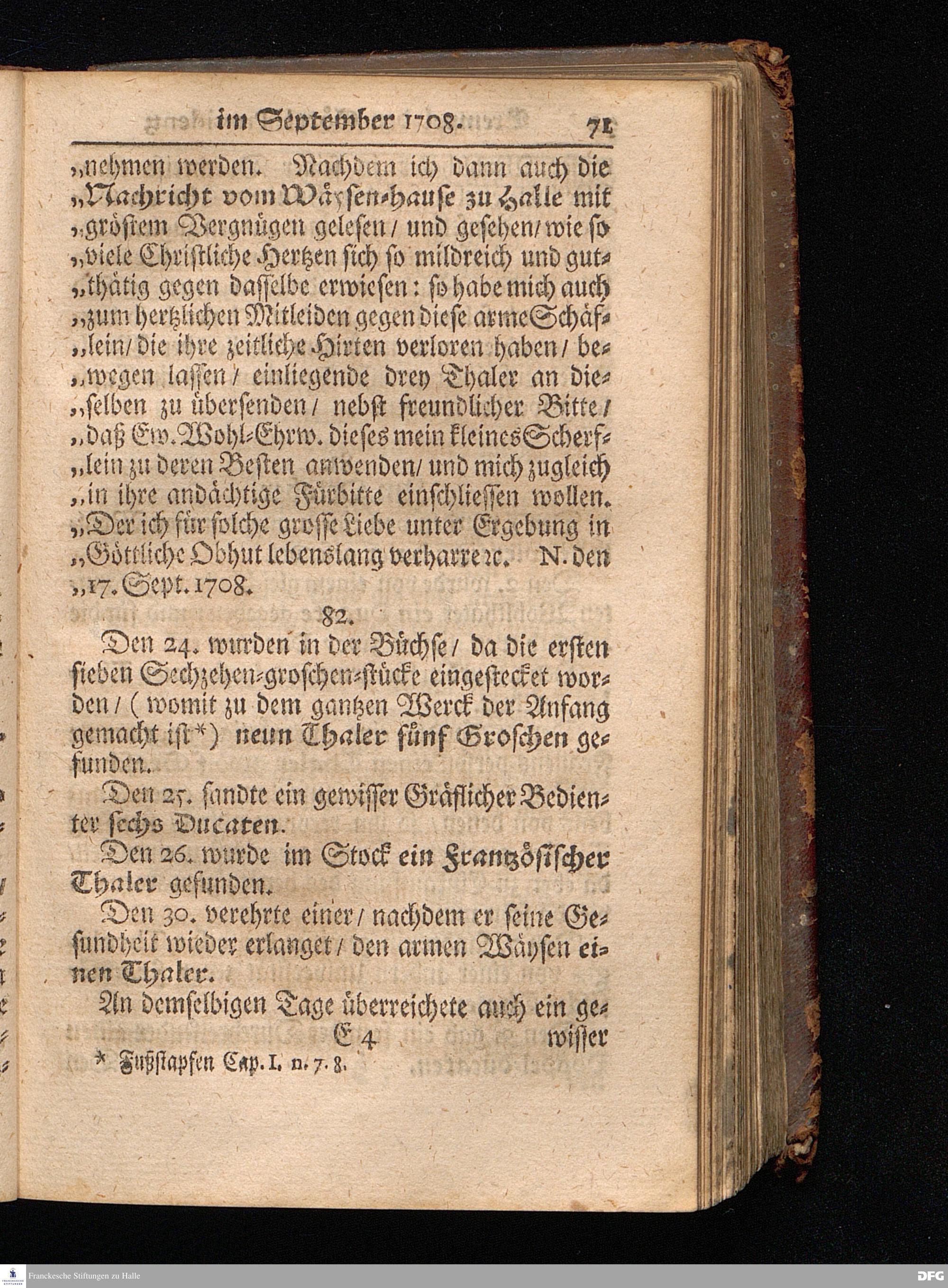 Segens=volle Fußstapfen des noch lebenden und waltenden liebreichen und getreuen GOttes / Zur Beschämung des Unglaubens und Stärckung des Glaubens entdecket durch eine wahrhafte und umständliche Nachricht von dem Wäysen=Hause und übrigen Anstalten zu Glaucha vor Halle: Welche im Jahr 1701. zum Druck befördert; ietzo aber zum dritten mal ediret / und bis auf gegenwärtiges Jahr fortgesetzet von August.Herm.Francken / S.Theol.Prof.und Past. Halle / in Verlegung des Wäysen=hauses / MDCCIX.