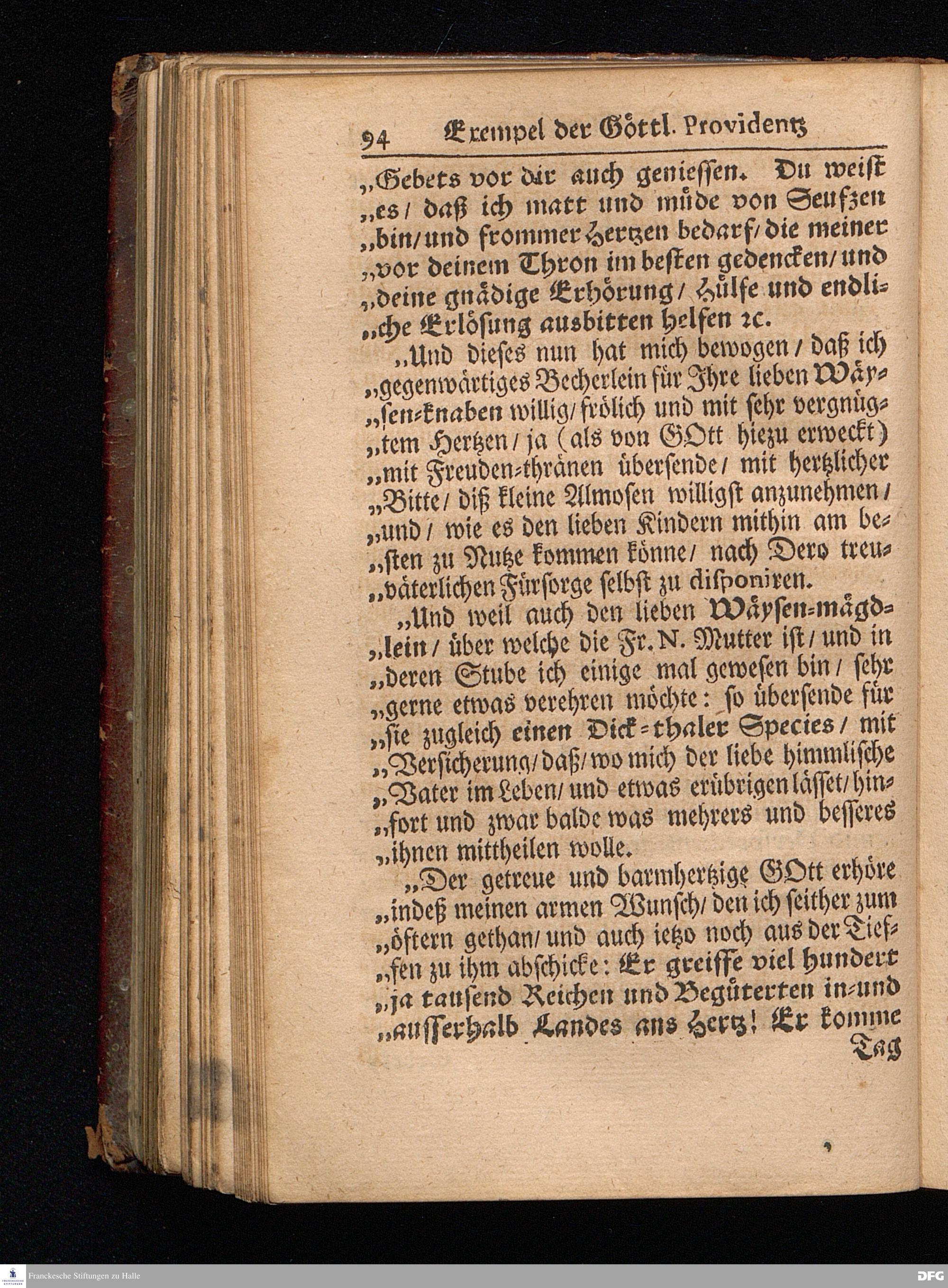 Segens=volle Fußstapfen des noch lebenden und waltenden liebreichen und getreuen GOttes / Zur Beschämung des Unglaubens und Stärckung des Glaubens entdecket durch eine wahrhafte und umständliche Nachricht von dem Wäysen=Hause und übrigen Anstalten zu Glaucha vor Halle: Welche im Jahr 1701. zum Druck befördert; ietzo aber zum dritten mal ediret / und bis auf gegenwärtiges Jahr fortgesetzet von August.Herm.Francken / S.Theol.Prof.und Past. Halle / in Verlegung des Wäysen=hauses / MDCCIX.