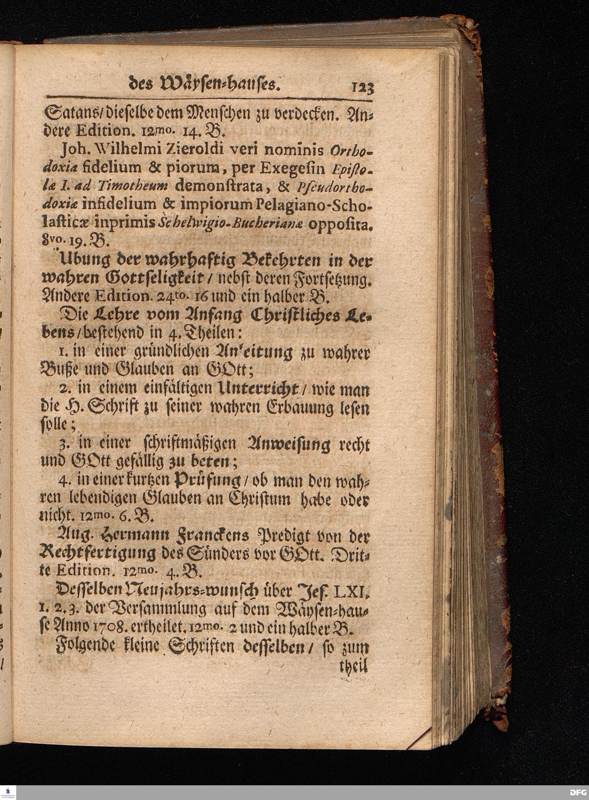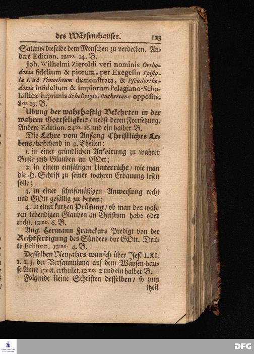 Segens=volle Fußstapfen des noch lebenden und waltenden liebreichen und getreuen GOttes / Zur Beschämung des Unglaubens und Stärckung des Glaubens entdecket durch eine wahrhafte und umständliche Nachricht von dem Wäysen=Hause und übrigen Anstalten zu Glaucha vor Halle: Welche im Jahr 1701. zum Druck befördert; ietzo aber zum dritten mal ediret / und bis auf gegenwärtiges Jahr fortgesetzet von August.Herm.Francken / S.Theol.Prof.und Past. Halle / in Verlegung des Wäysen=hauses / MDCCIX.