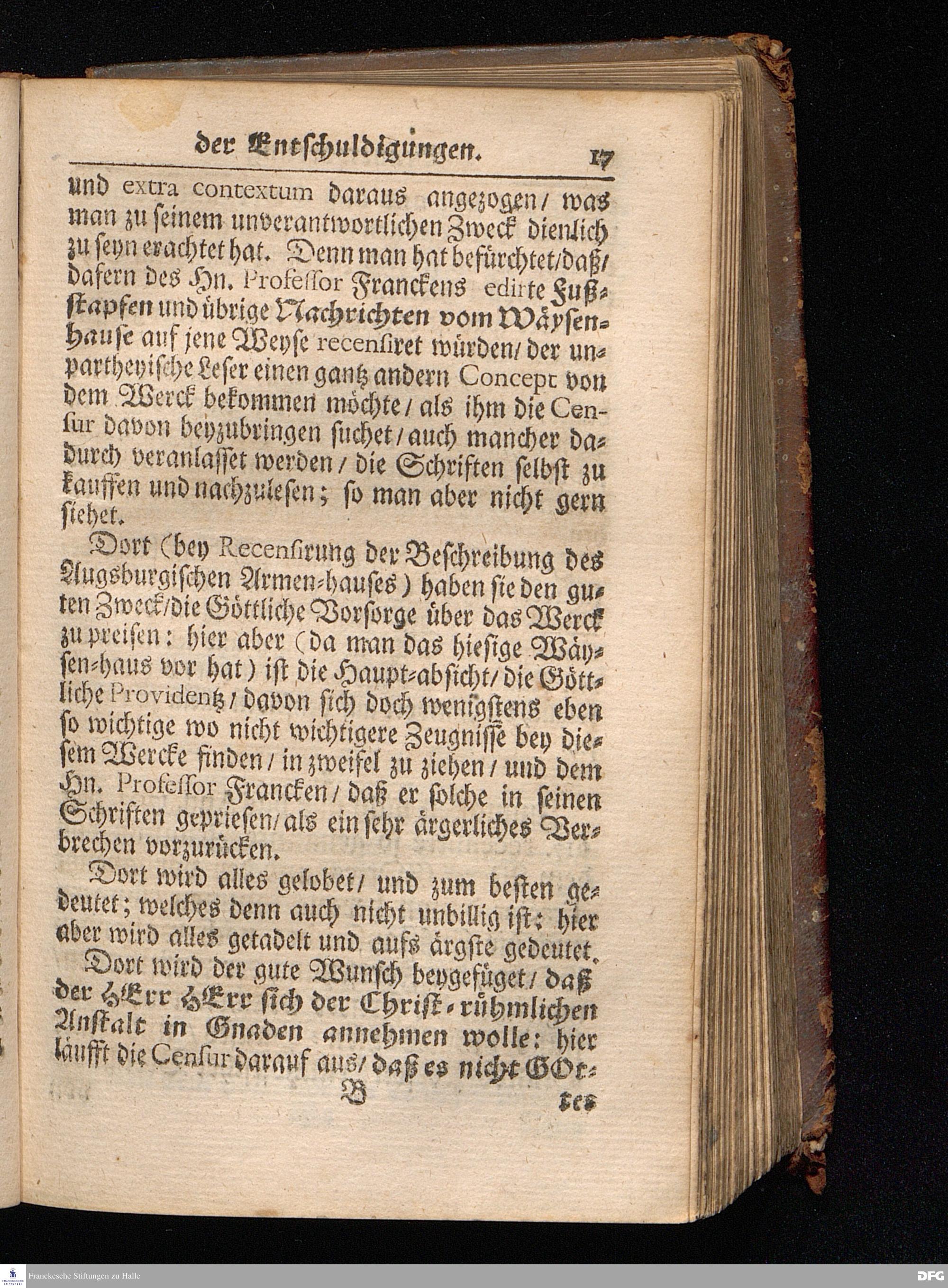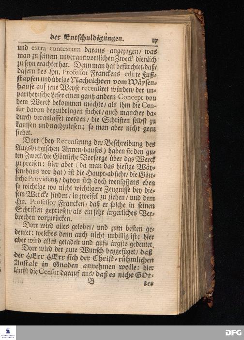 Segens=volle Fußstapfen des noch lebenden und waltenden liebreichen und getreuen GOttes / Zur Beschämung des Unglaubens und Stärckung des Glaubens entdecket durch eine wahrhafte und umständliche Nachricht von dem Wäysen=Hause und übrigen Anstalten zu Glaucha vor Halle: Welche im Jahr 1701. zum Druck befördert; ietzo aber zum dritten mal ediret / und bis auf gegenwärtiges Jahr fortgesetzet von August.Herm.Francken / S.Theol.Prof.und Past. Halle / in Verlegung des Wäysen=hauses / MDCCIX.