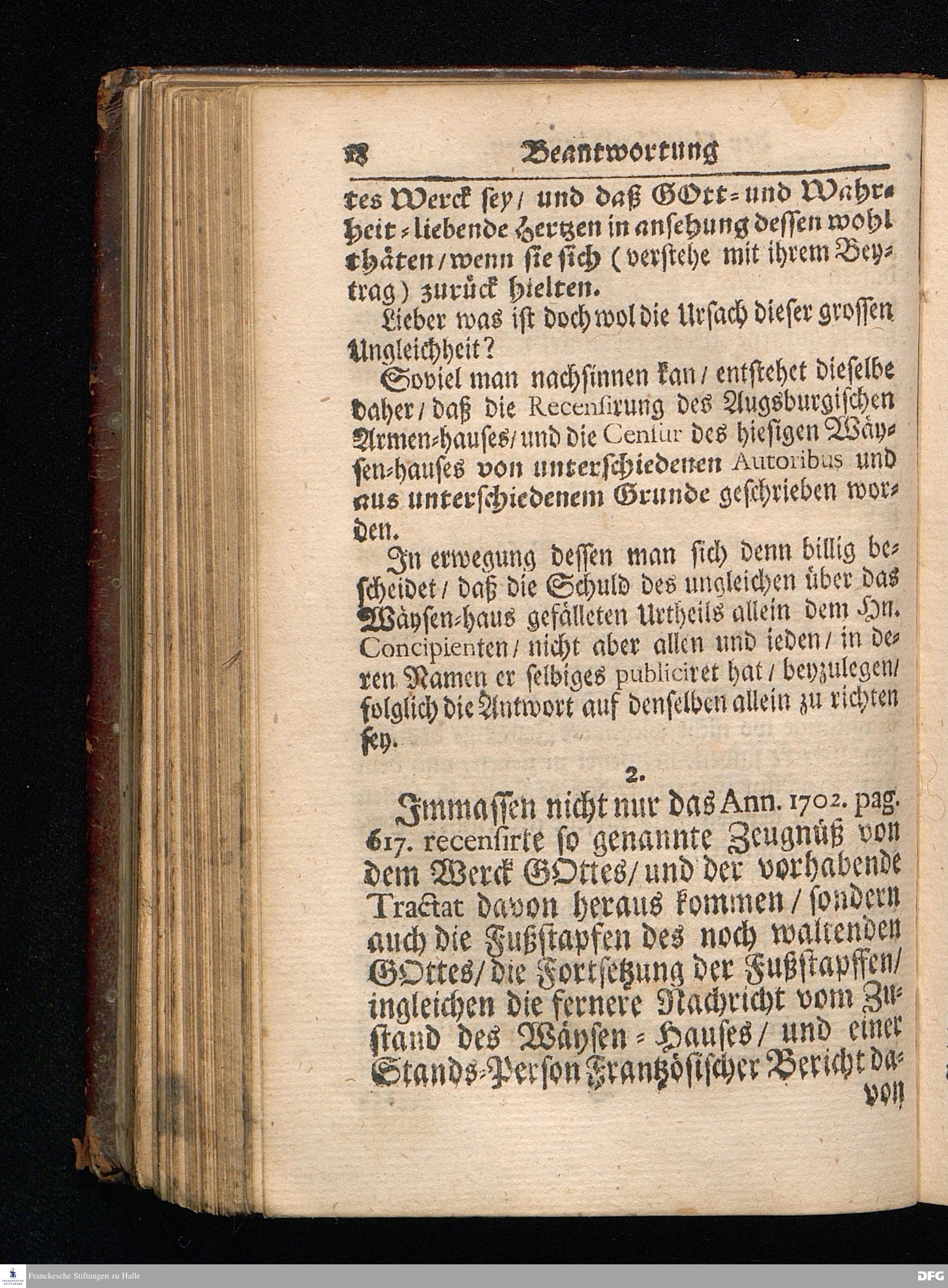 Segens=volle Fußstapfen des noch lebenden und waltenden liebreichen und getreuen GOttes / Zur Beschämung des Unglaubens und Stärckung des Glaubens entdecket durch eine wahrhafte und umständliche Nachricht von dem Wäysen=Hause und übrigen Anstalten zu Glaucha vor Halle: Welche im Jahr 1701. zum Druck befördert; ietzo aber zum dritten mal ediret / und bis auf gegenwärtiges Jahr fortgesetzet von August.Herm.Francken / S.Theol.Prof.und Past. Halle / in Verlegung des Wäysen=hauses / MDCCIX.
