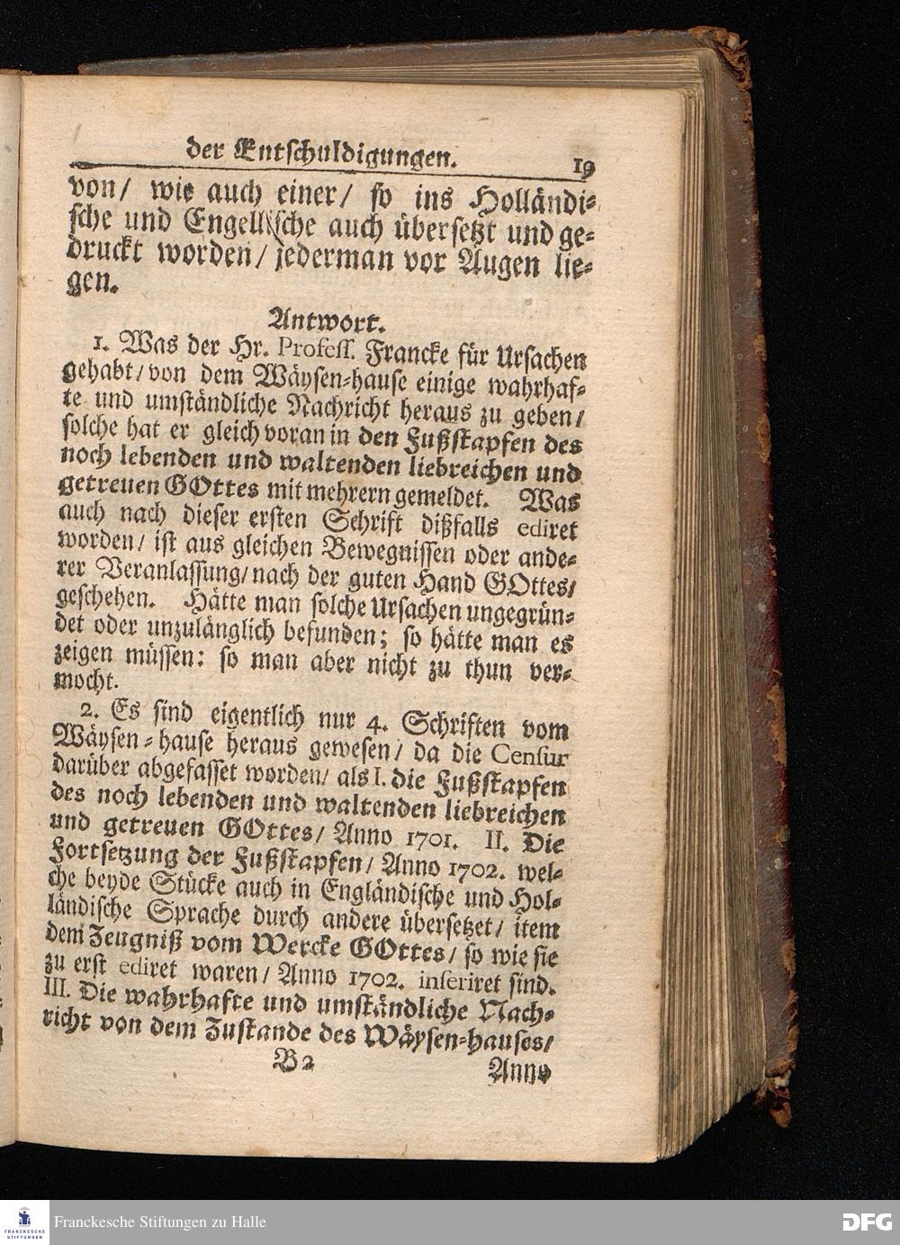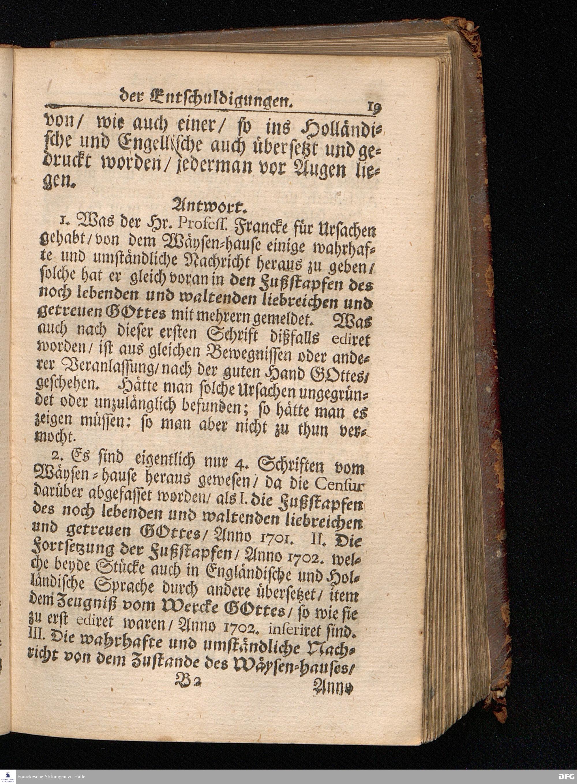 Segens=volle Fußstapfen des noch lebenden und waltenden liebreichen und getreuen GOttes / Zur Beschämung des Unglaubens und Stärckung des Glaubens entdecket durch eine wahrhafte und umständliche Nachricht von dem Wäysen=Hause und übrigen Anstalten zu Glaucha vor Halle: Welche im Jahr 1701. zum Druck befördert; ietzo aber zum dritten mal ediret / und bis auf gegenwärtiges Jahr fortgesetzet von August.Herm.Francken / S.Theol.Prof.und Past. Halle / in Verlegung des Wäysen=hauses / MDCCIX.