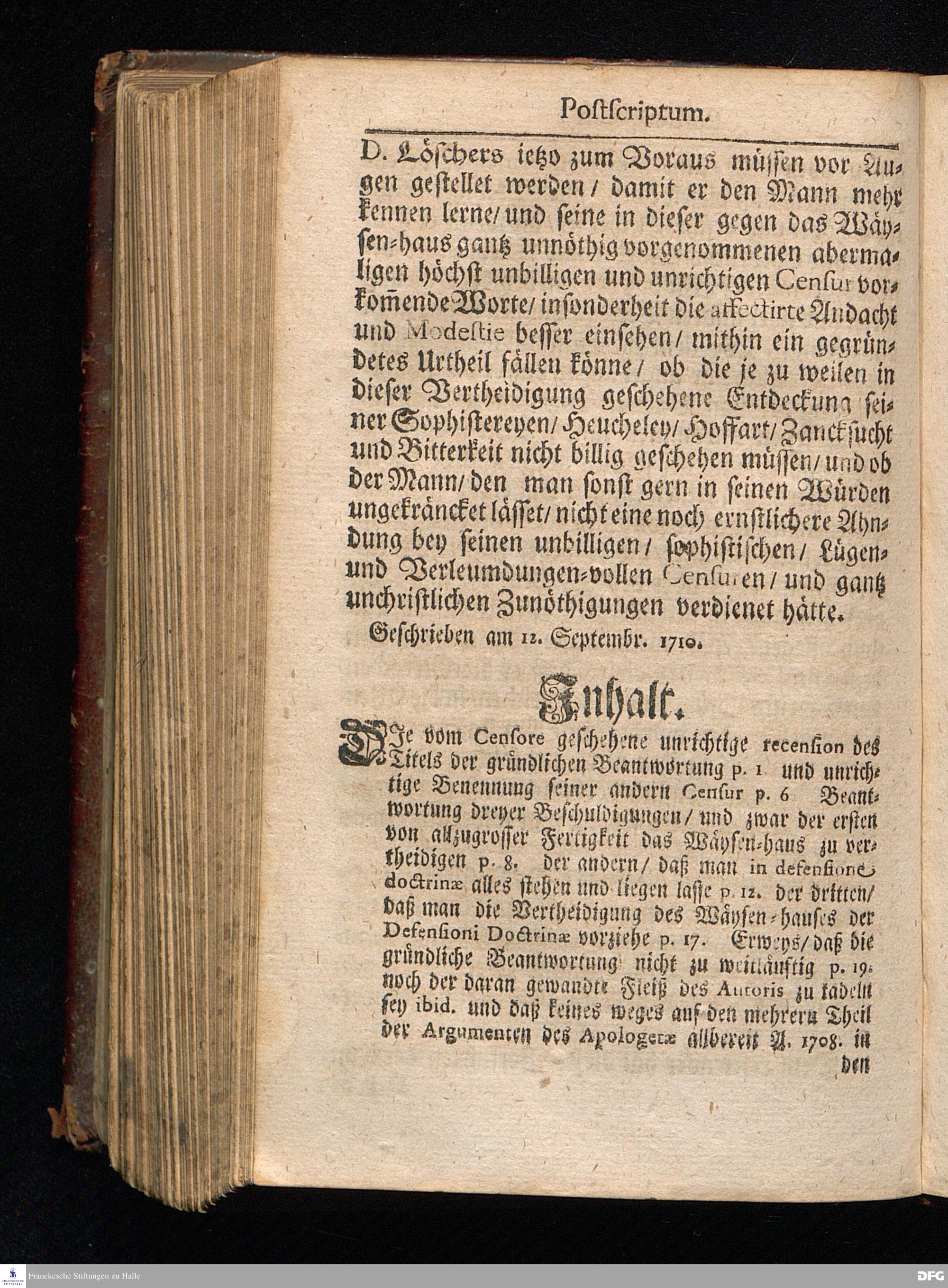 Segens=volle Fußstapfen des noch lebenden und waltenden liebreichen und getreuen GOttes / Zur Beschämung des Unglaubens und Stärckung des Glaubens entdecket durch eine wahrhafte und umständliche Nachricht von dem Wäysen=Hause und übrigen Anstalten zu Glaucha vor Halle: Welche im Jahr 1701. zum Druck befördert; ietzo aber zum dritten mal ediret / und bis auf gegenwärtiges Jahr fortgesetzet von August.Herm.Francken / S.Theol.Prof.und Past. Halle / in Verlegung des Wäysen=hauses / MDCCIX.