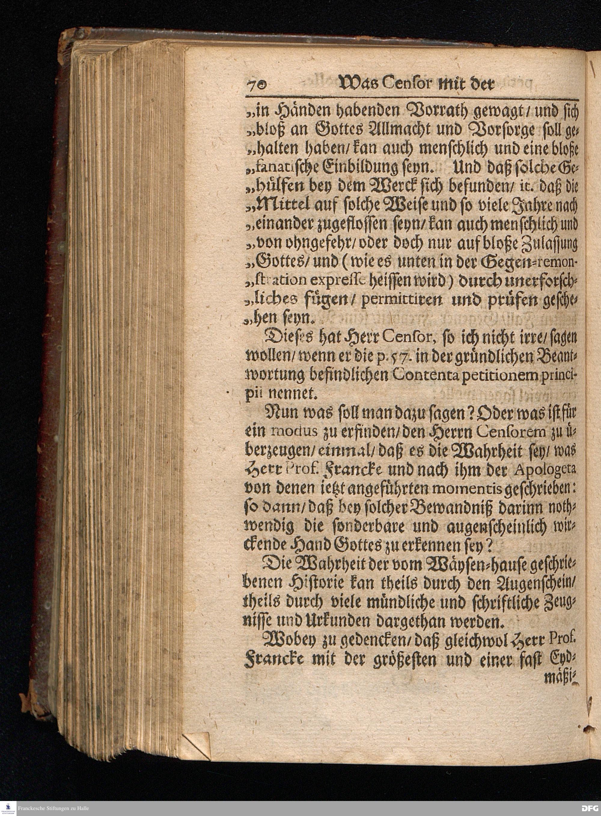 Segens=volle Fußstapfen des noch lebenden und waltenden liebreichen und getreuen GOttes / Zur Beschämung des Unglaubens und Stärckung des Glaubens entdecket durch eine wahrhafte und umständliche Nachricht von dem Wäysen=Hause und übrigen Anstalten zu Glaucha vor Halle: Welche im Jahr 1701. zum Druck befördert; ietzo aber zum dritten mal ediret / und bis auf gegenwärtiges Jahr fortgesetzet von August.Herm.Francken / S.Theol.Prof.und Past. Halle / in Verlegung des Wäysen=hauses / MDCCIX.