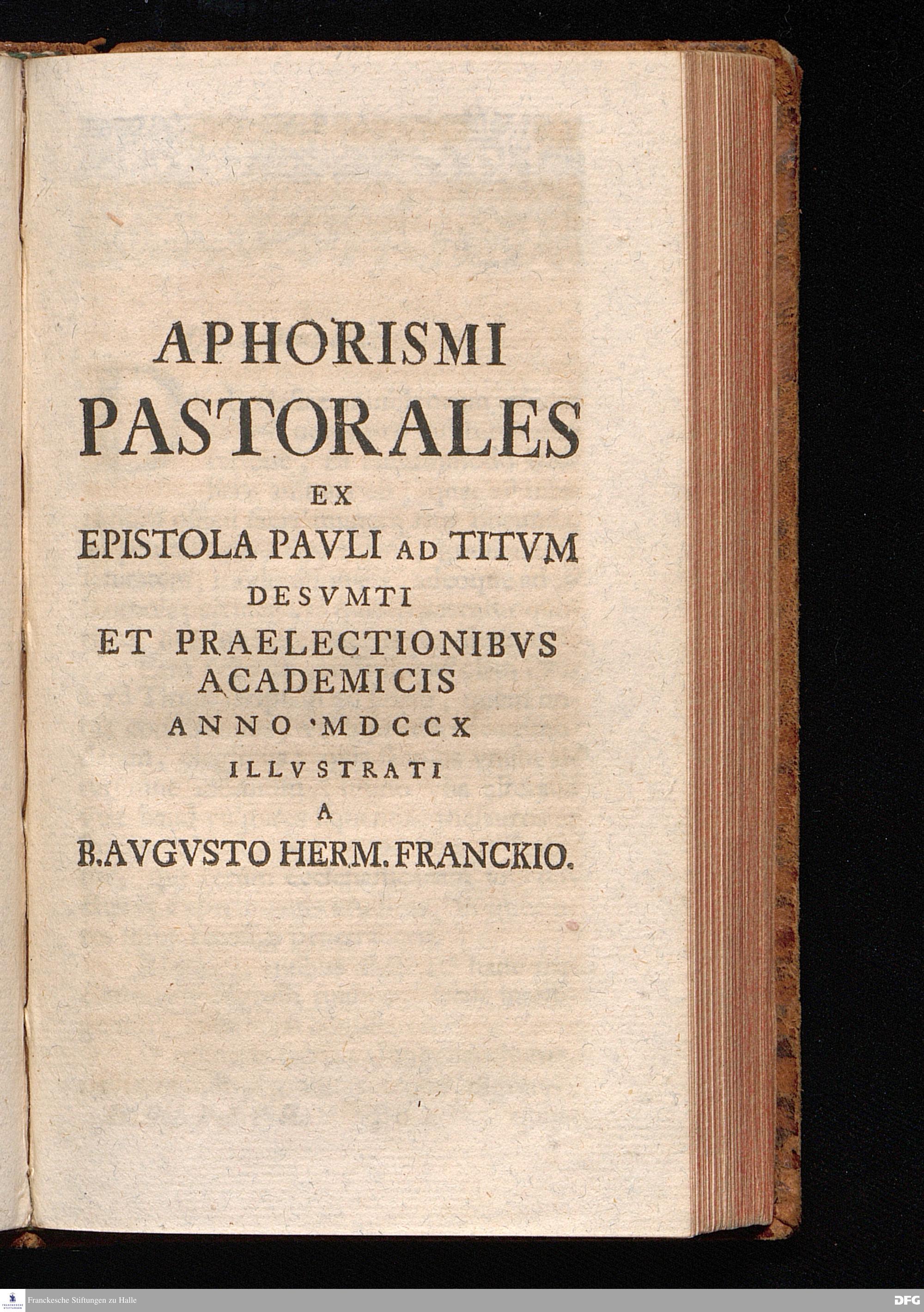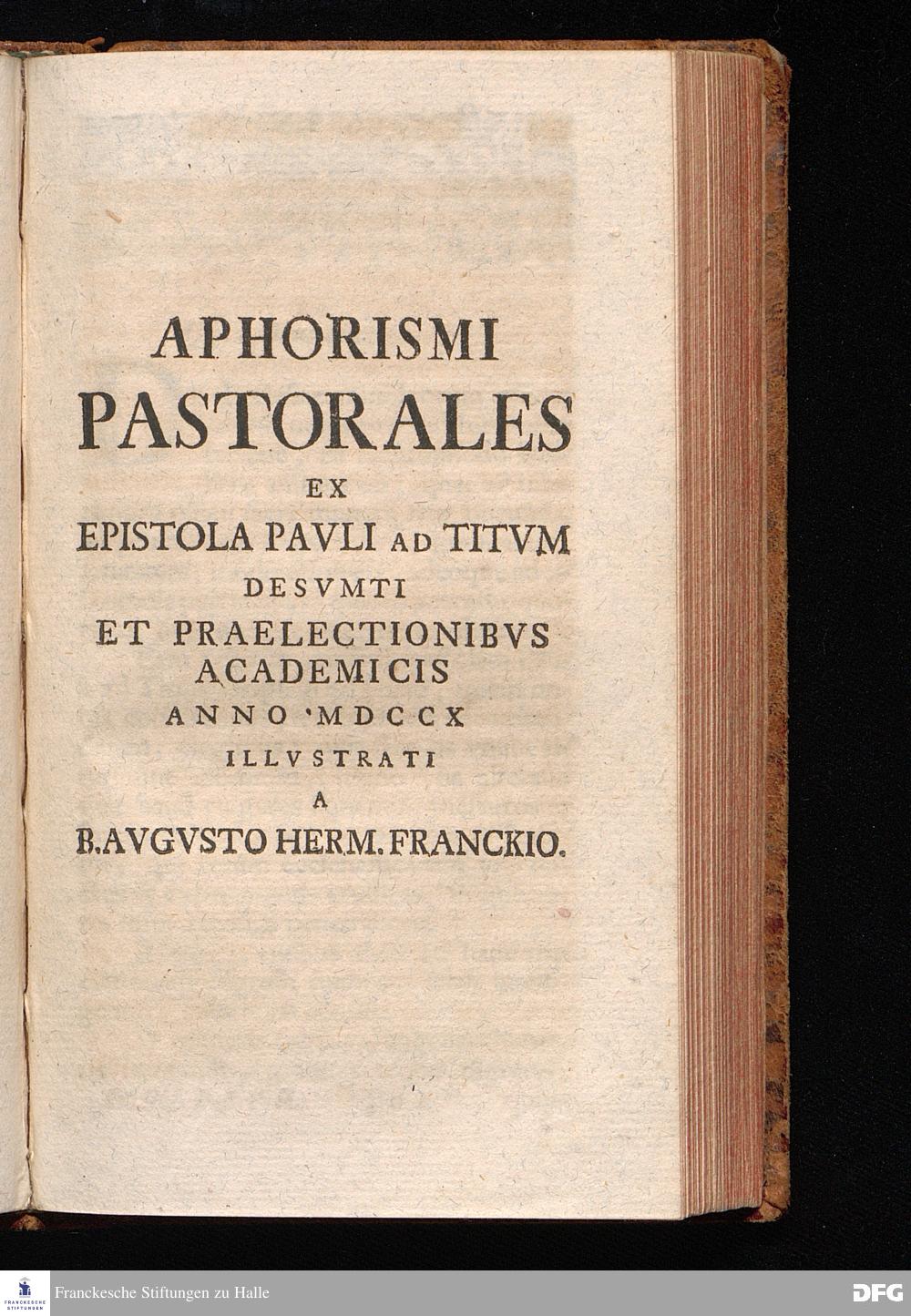August Herr[!]mann Franckens, Weyl.S.Theol.Prof.Past.Vlric.et Schol. COLLEGIVM PASTORALE über D. IO. LVDOV. HARTMANNI PASTORALE EVANGELICVM. Anderer Theil; Nebst desselben Aus der Epistel an den Titum gezogenen und mit mehrerm erläuterten APHORISMIS PASTORALIBVS: herausgegeben von Gotthilf August Francken S.Theol.Doct.und Prof.Publ.Ord.der ersten Dioeces des Saal-Creyses Insp.und Pr.zur L.Fr. HALLE, In Verlegung des Wäysenhauses, 1743.