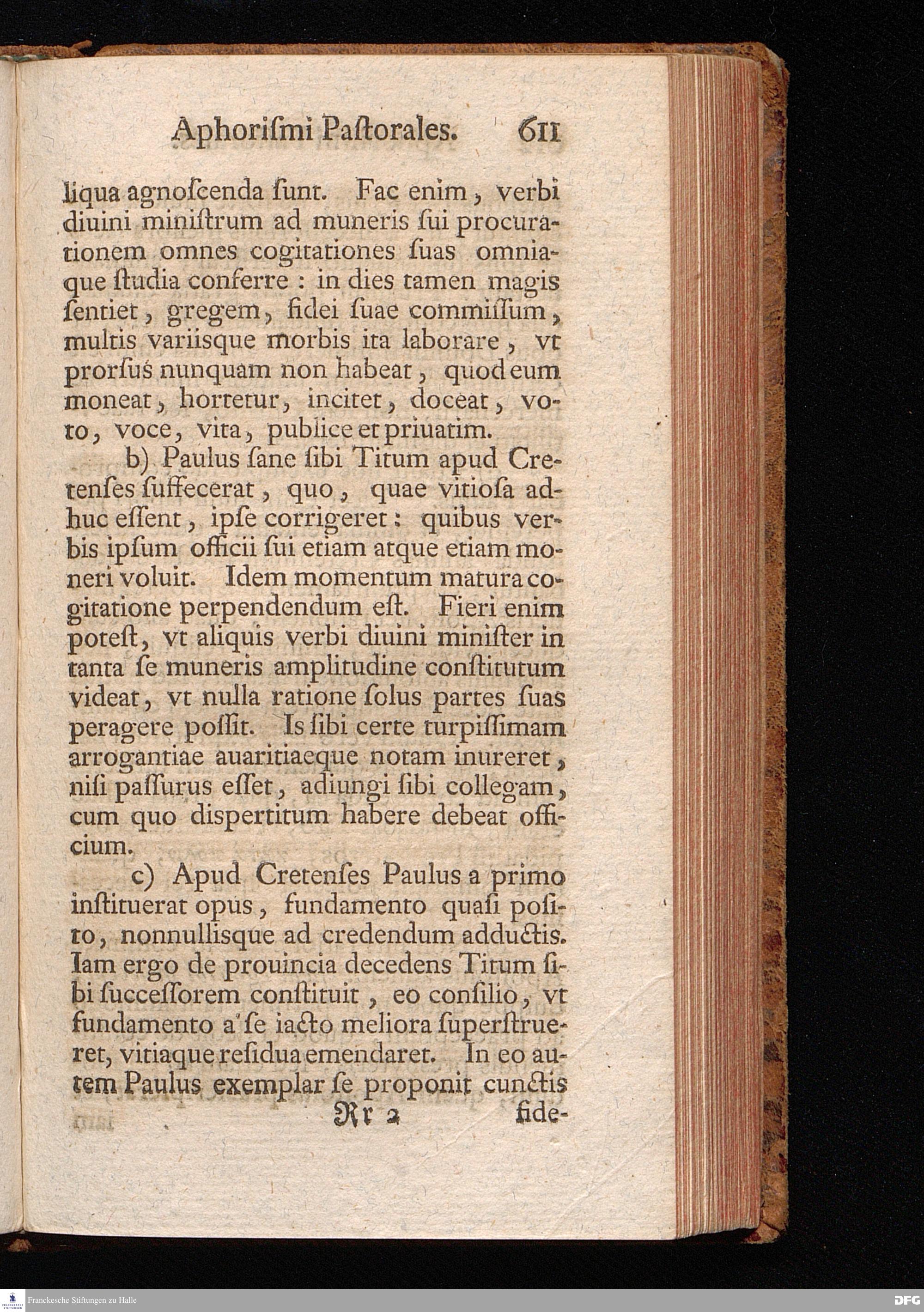 August Herr[!]mann Franckens, Weyl.S.Theol.Prof.Past.Vlric.et Schol. COLLEGIVM PASTORALE über D. IO. LVDOV. HARTMANNI PASTORALE EVANGELICVM. Anderer Theil; Nebst desselben Aus der Epistel an den Titum gezogenen und mit mehrerm erläuterten APHORISMIS PASTORALIBVS: herausgegeben von Gotthilf August Francken S.Theol.Doct.und Prof.Publ.Ord.der ersten Dioeces des Saal-Creyses Insp.und Pr.zur L.Fr. HALLE, In Verlegung des Wäysenhauses, 1743.