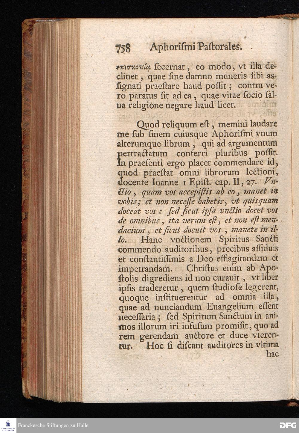 August Herr[!]mann Franckens, Weyl.S.Theol.Prof.Past.Vlric.et Schol. COLLEGIVM PASTORALE über D. IO. LVDOV. HARTMANNI PASTORALE EVANGELICVM. Anderer Theil; Nebst desselben Aus der Epistel an den Titum gezogenen und mit mehrerm erläuterten APHORISMIS PASTORALIBVS: herausgegeben von Gotthilf August Francken S.Theol.Doct.und Prof.Publ.Ord.der ersten Dioeces des Saal-Creyses Insp.und Pr.zur L.Fr. HALLE, In Verlegung des Wäysenhauses, 1743.