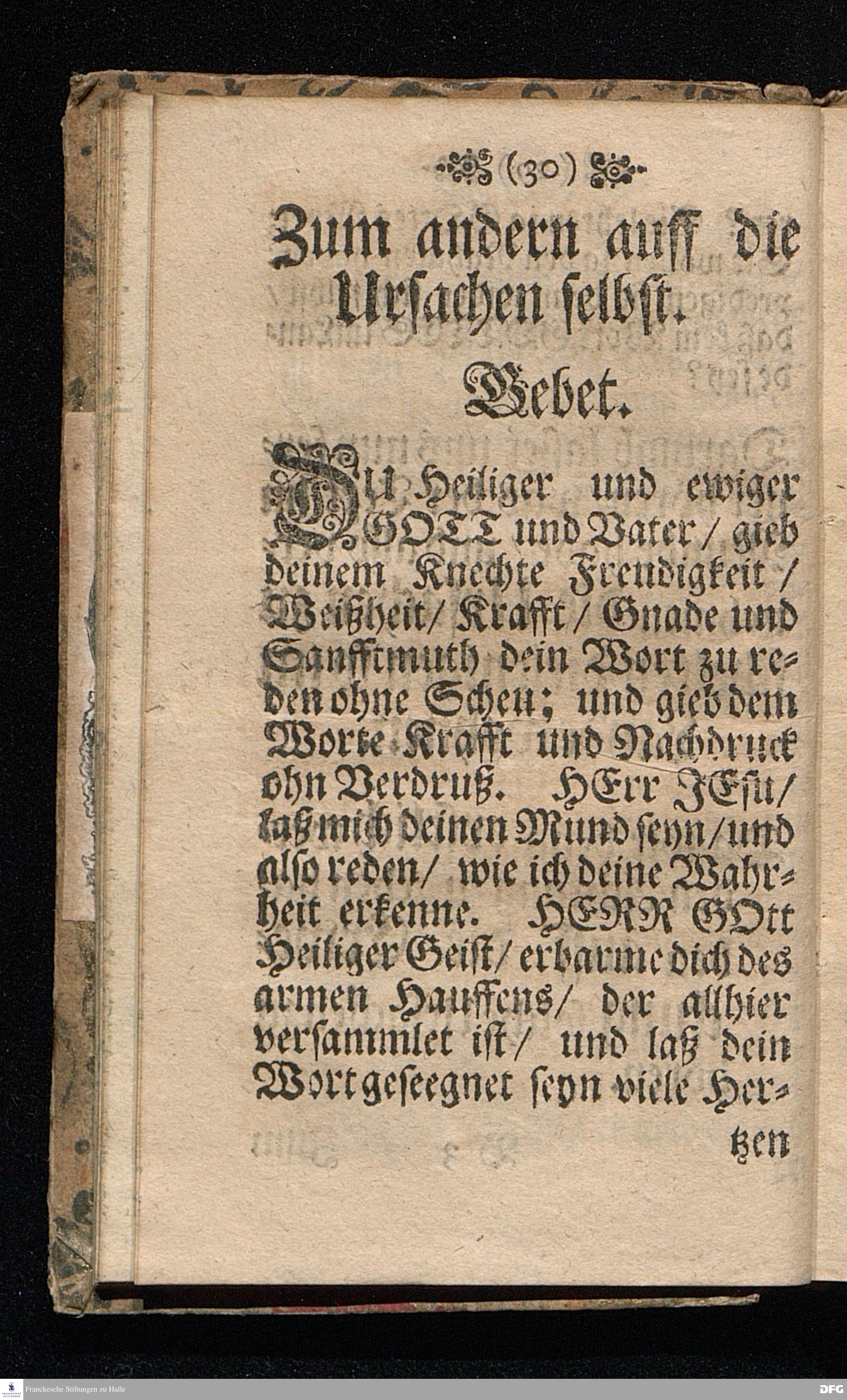 Die Ursachen Gottes zu schelten die so im Lande wohnen / In einer Buß=Predigt Uber Hos.IV,I. d.7.October 1698, In der St.Georgen=Kirche zu Glaucha an Halle vorgestellet von M.August Hermann Francken / SS.Theol.Gr.& OO.LL.P.Ord.& P.Glauch. HALLE / Gedruckt bey Christ.Henckel / 1698.