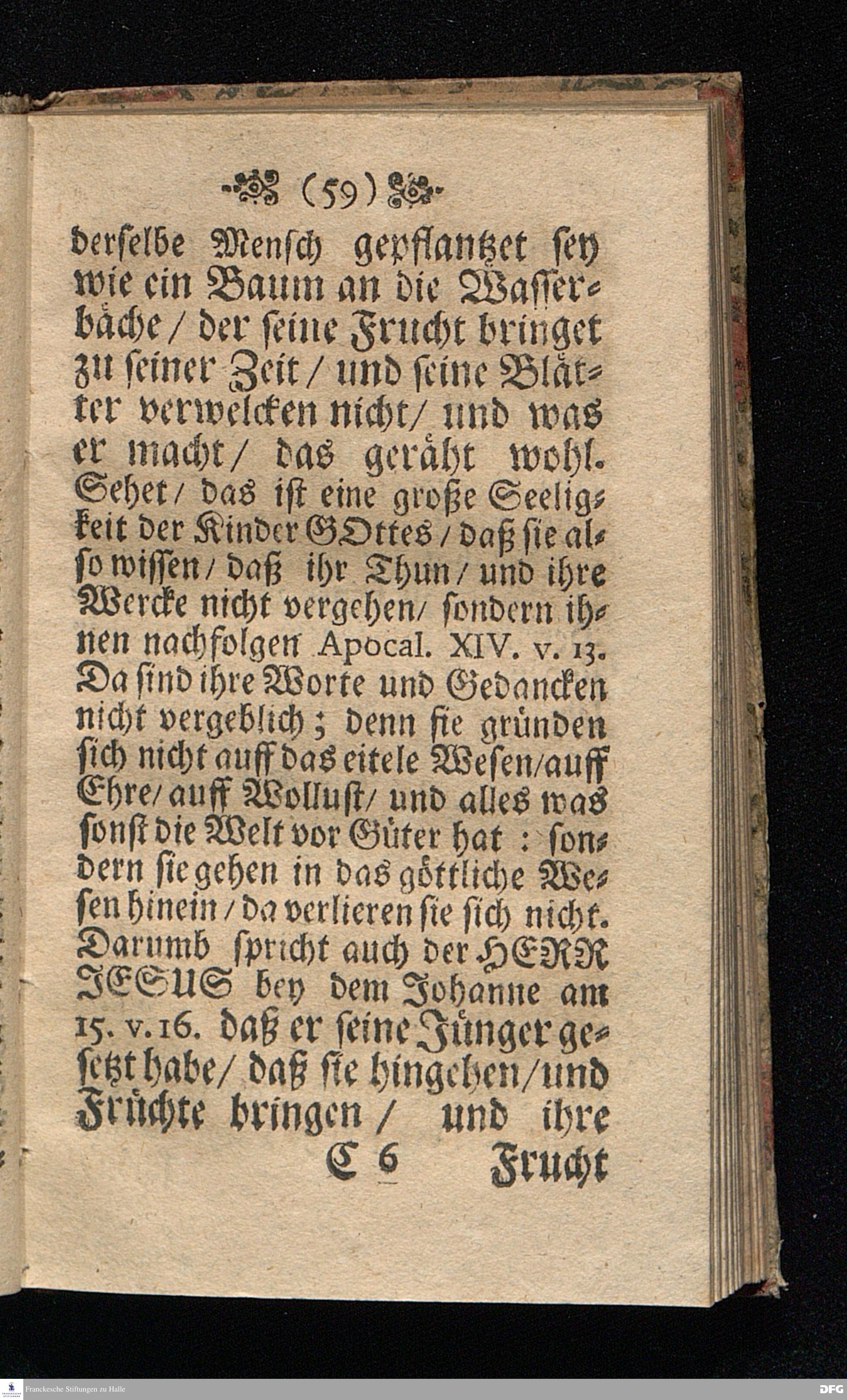 Die Ursachen Gottes zu schelten die so im Lande wohnen / In einer Buß=Predigt Uber Hos.IV,I. d.7.October 1698, In der St.Georgen=Kirche zu Glaucha an Halle vorgestellet von M.August Hermann Francken / SS.Theol.Gr.& OO.LL.P.Ord.& P.Glauch. HALLE / Gedruckt bey Christ.Henckel / 1698.