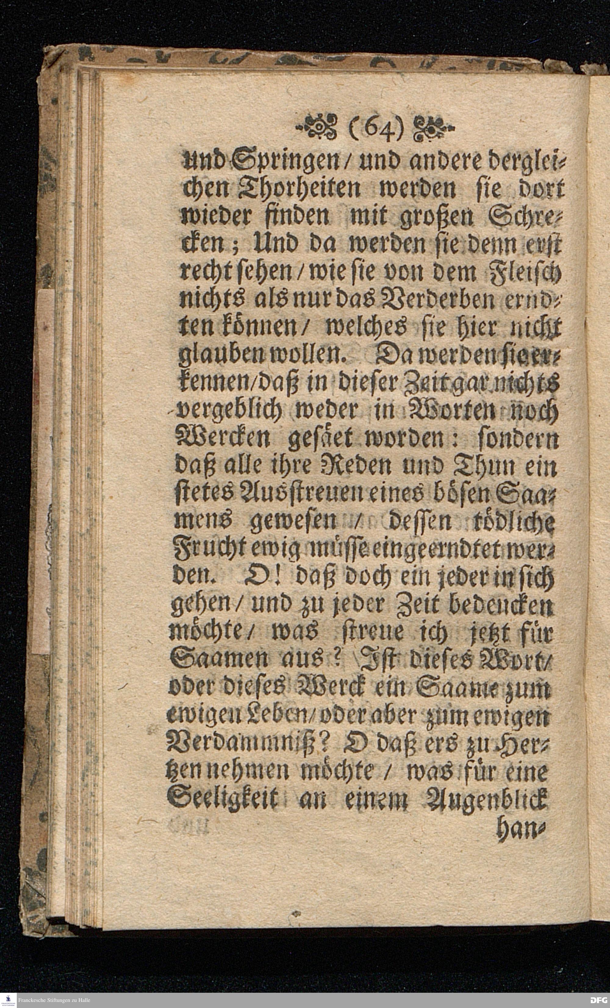 Die Ursachen Gottes zu schelten die so im Lande wohnen / In einer Buß=Predigt Uber Hos.IV,I. d.7.October 1698, In der St.Georgen=Kirche zu Glaucha an Halle vorgestellet von M.August Hermann Francken / SS.Theol.Gr.& OO.LL.P.Ord.& P.Glauch. HALLE / Gedruckt bey Christ.Henckel / 1698.