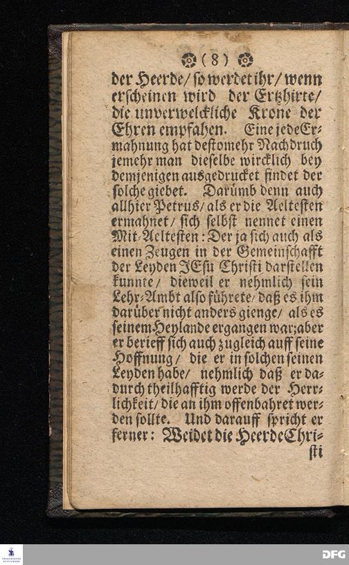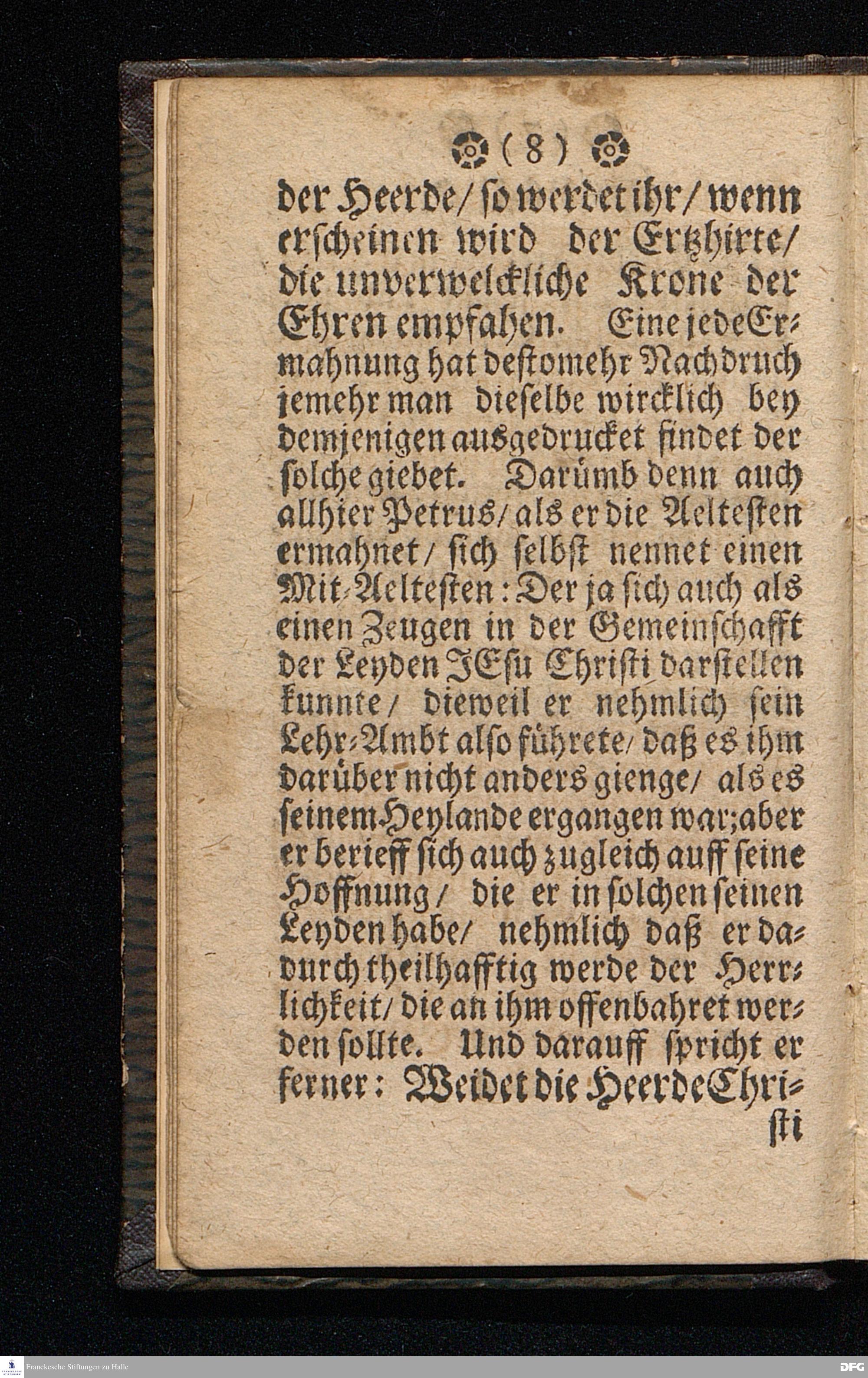 Der Dienst getreüer Lehrer nach dem Vorbilde CHristi. Am Sonntage MISERICORDIAS DOMINI Anno 1699. In einer Predigt Uber das Evangelium Joh.X, v.12--16. In der St.Georgen=Kirche zu Glaucha an Halle vorgestellet / von M.August Hermann Francken / SS.Theol.P.Ord.& P.Glauch. HALLE / Druckts Chr.Henckel / U.B. 1700.