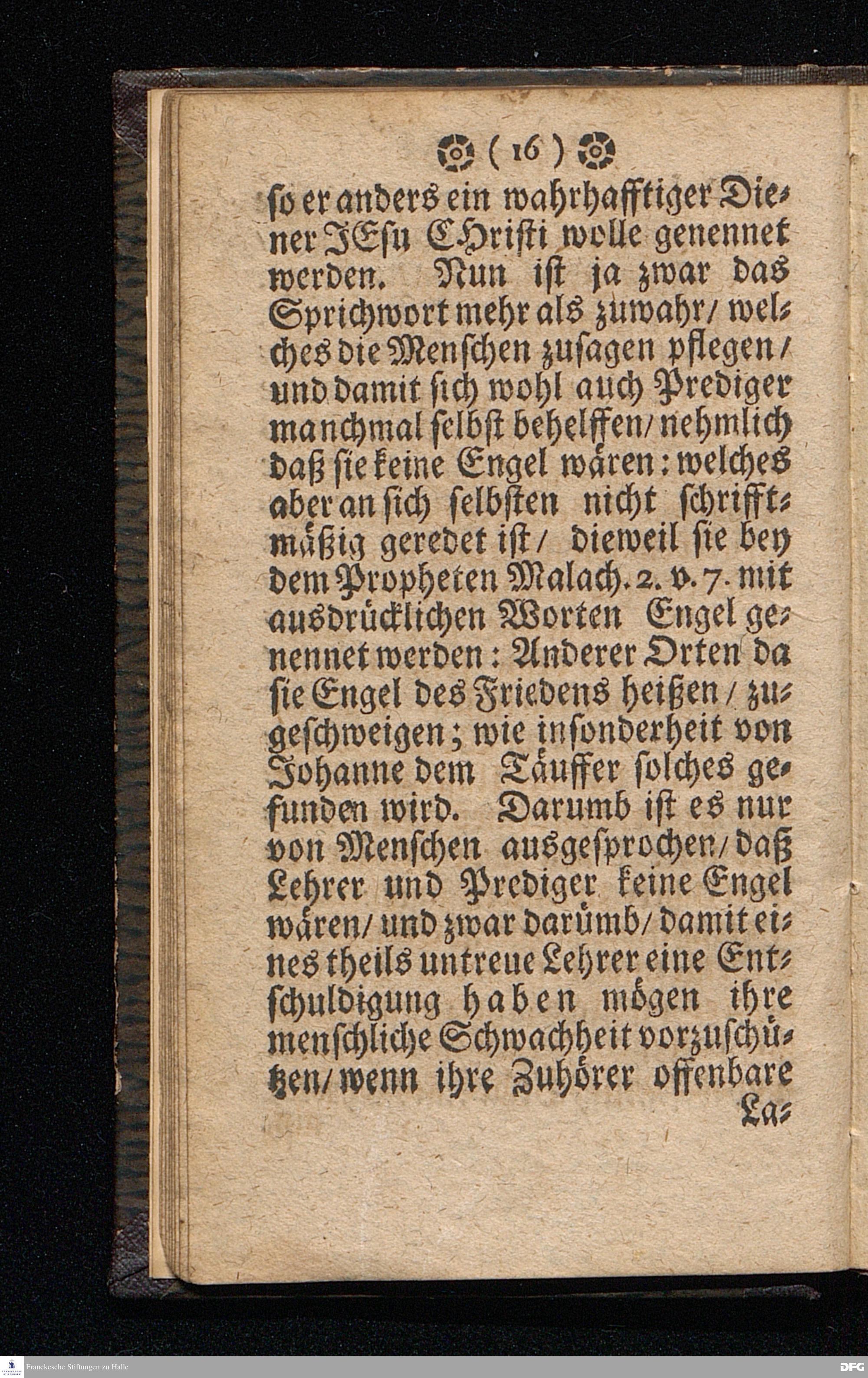 Der Dienst getreüer Lehrer nach dem Vorbilde CHristi. Am Sonntage MISERICORDIAS DOMINI Anno 1699. In einer Predigt Uber das Evangelium Joh.X, v.12--16. In der St.Georgen=Kirche zu Glaucha an Halle vorgestellet / von M.August Hermann Francken / SS.Theol.P.Ord.& P.Glauch. HALLE / Druckts Chr.Henckel / U.B. 1700.