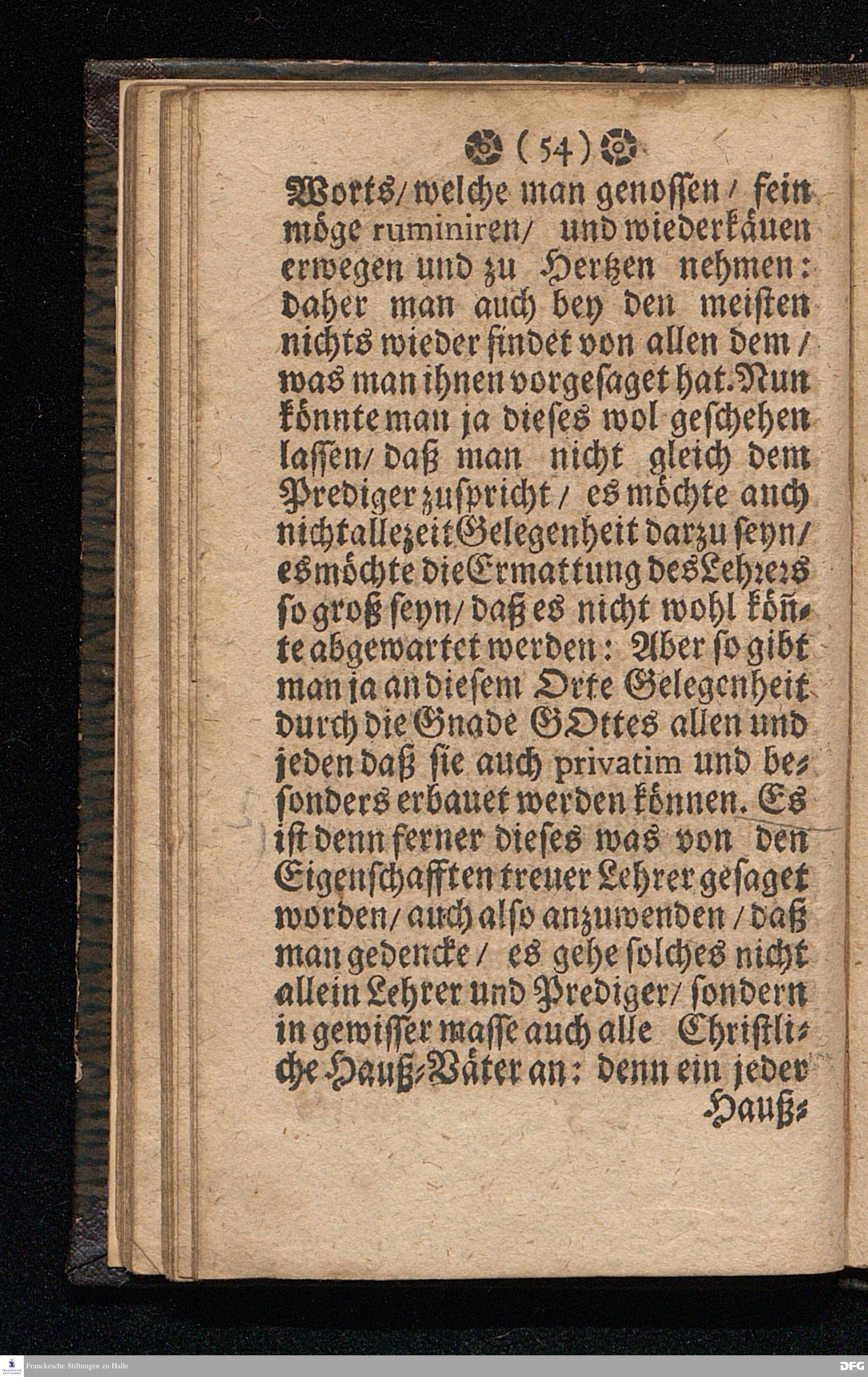 Der Dienst getreüer Lehrer nach dem Vorbilde CHristi. Am Sonntage MISERICORDIAS DOMINI Anno 1699. In einer Predigt Uber das Evangelium Joh.X, v.12--16. In der St.Georgen=Kirche zu Glaucha an Halle vorgestellet / von M.August Hermann Francken / SS.Theol.P.Ord.& P.Glauch. HALLE / Druckts Chr.Henckel / U.B. 1700.
