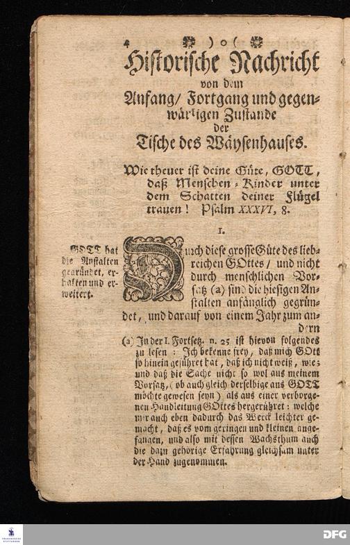 Der von GOTT in dem Wäysenhause zu Glaucha an Halle (für ietzo auf 500. Personen) Zubereitete Tisch / Nach seinem Anfang / Fortgang / gegenwärtigem Zustand und eingeführter Tisch=Ordnung kürtzlich beschrieben, mit angehängten 2. Erweckungs Reden / Deren die erste Anno 1699. [vielmehr 1700!] bey Einweihung des damaligen kleinern Speise=Saals, Die andere Anno 1711. bey Einweihung des grossen Saals gehalten worden, von August Hermann Francken / S.Theol.Prof.& Past.zu S.Ulrich / und des Gymnasii Scholarcha, h.t. Acad.Pro-Rectore. HALLE, In Verlegung des Wäysenhauses, MDCCXVII.