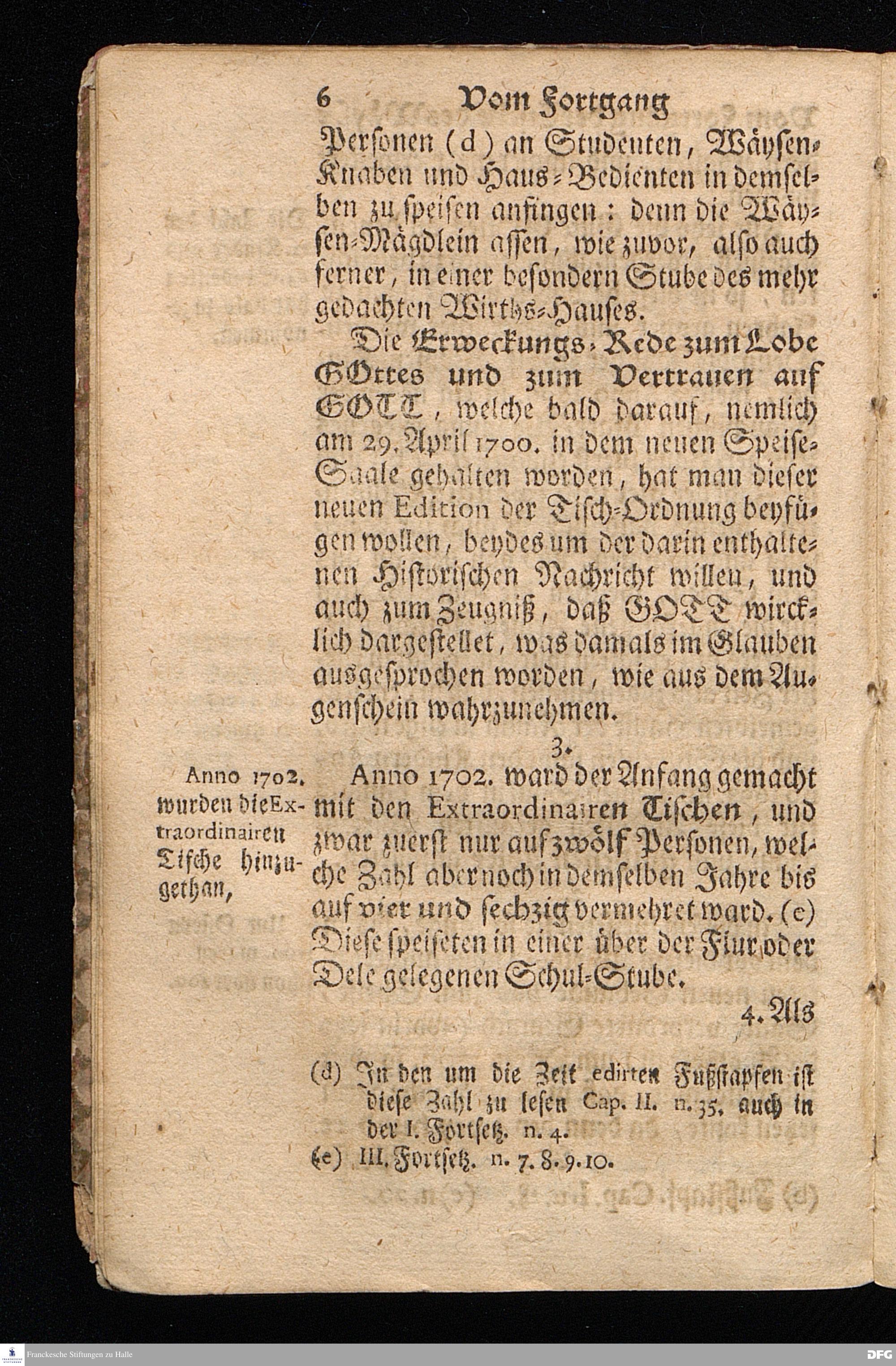 Der von GOTT in dem Wäysenhause zu Glaucha an Halle (für ietzo auf 500. Personen) Zubereitete Tisch / Nach seinem Anfang / Fortgang / gegenwärtigem Zustand und eingeführter Tisch=Ordnung kürtzlich beschrieben, mit angehängten 2. Erweckungs Reden / Deren die erste Anno 1699. [vielmehr 1700!] bey Einweihung des damaligen kleinern Speise=Saals, Die andere Anno 1711. bey Einweihung des grossen Saals gehalten worden, von August Hermann Francken / S.Theol.Prof.& Past.zu S.Ulrich / und des Gymnasii Scholarcha, h.t. Acad.Pro-Rectore. HALLE, In Verlegung des Wäysenhauses, MDCCXVII.