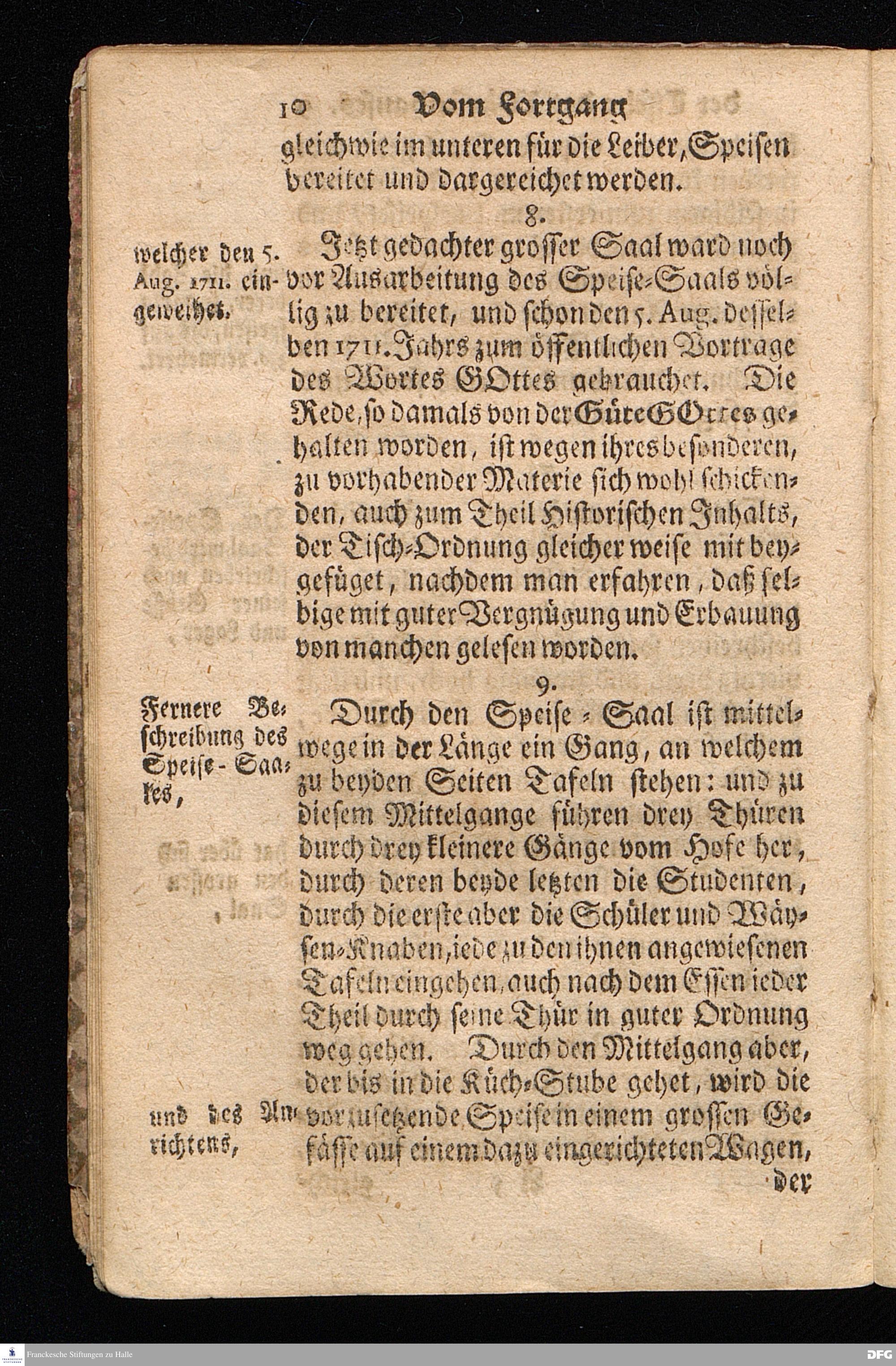 Der von GOTT in dem Wäysenhause zu Glaucha an Halle (für ietzo auf 500. Personen) Zubereitete Tisch / Nach seinem Anfang / Fortgang / gegenwärtigem Zustand und eingeführter Tisch=Ordnung kürtzlich beschrieben, mit angehängten 2. Erweckungs Reden / Deren die erste Anno 1699. [vielmehr 1700!] bey Einweihung des damaligen kleinern Speise=Saals, Die andere Anno 1711. bey Einweihung des grossen Saals gehalten worden, von August Hermann Francken / S.Theol.Prof.& Past.zu S.Ulrich / und des Gymnasii Scholarcha, h.t. Acad.Pro-Rectore. HALLE, In Verlegung des Wäysenhauses, MDCCXVII.