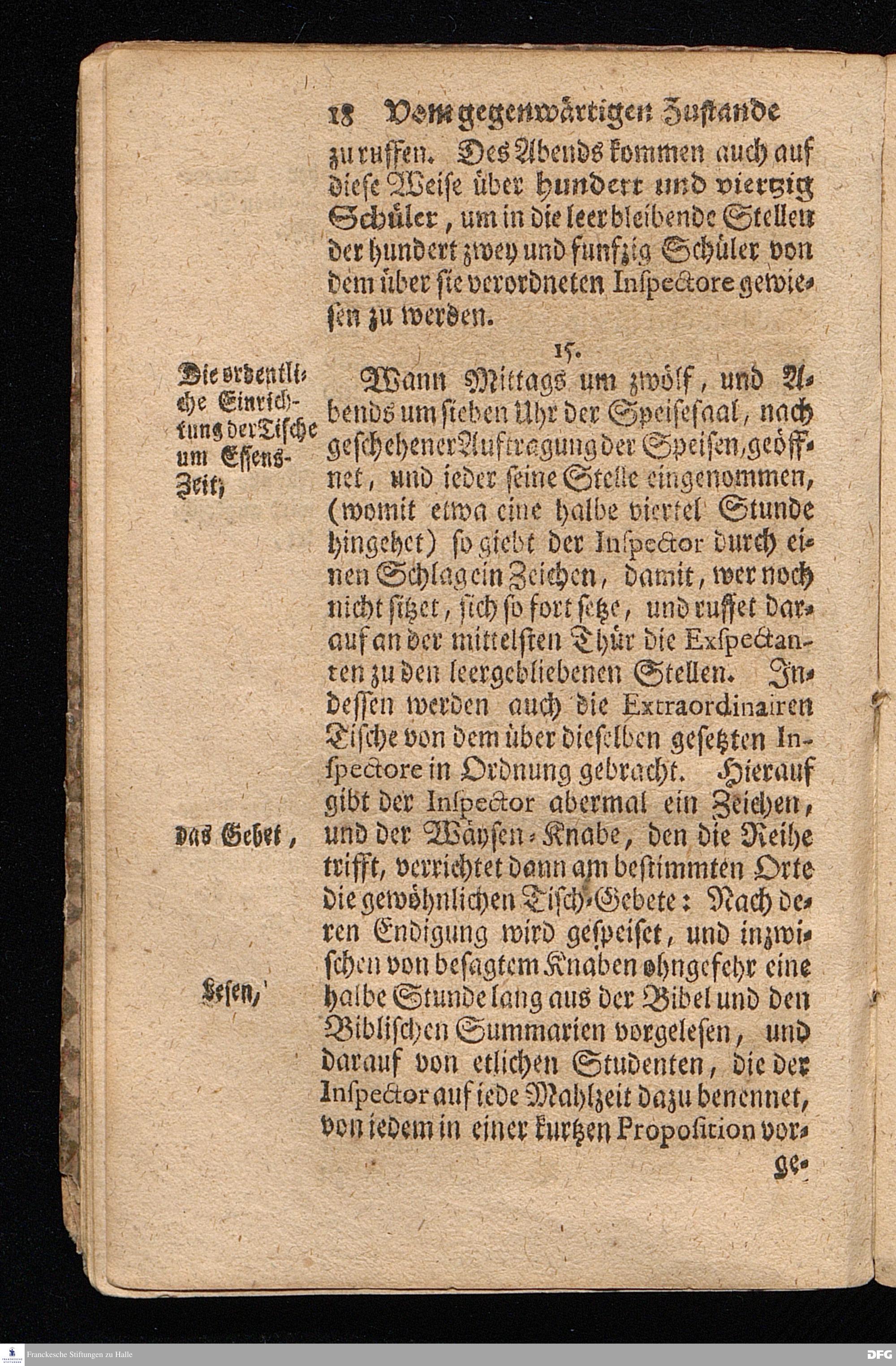 Der von GOTT in dem Wäysenhause zu Glaucha an Halle (für ietzo auf 500. Personen) Zubereitete Tisch / Nach seinem Anfang / Fortgang / gegenwärtigem Zustand und eingeführter Tisch=Ordnung kürtzlich beschrieben, mit angehängten 2. Erweckungs Reden / Deren die erste Anno 1699. [vielmehr 1700!] bey Einweihung des damaligen kleinern Speise=Saals, Die andere Anno 1711. bey Einweihung des grossen Saals gehalten worden, von August Hermann Francken / S.Theol.Prof.& Past.zu S.Ulrich / und des Gymnasii Scholarcha, h.t. Acad.Pro-Rectore. HALLE, In Verlegung des Wäysenhauses, MDCCXVII.