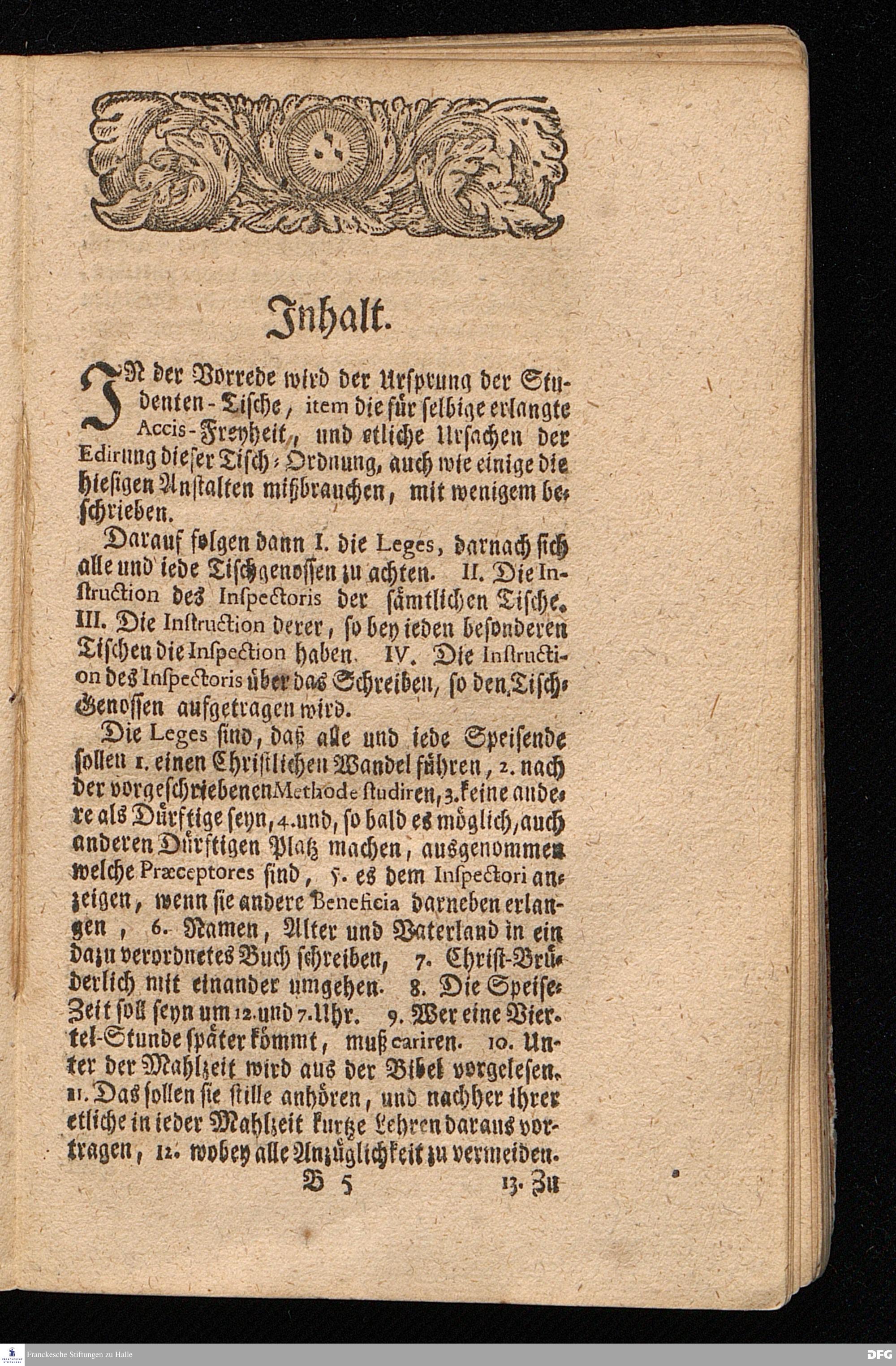 Der von GOTT in dem Wäysenhause zu Glaucha an Halle (für ietzo auf 500. Personen) Zubereitete Tisch / Nach seinem Anfang / Fortgang / gegenwärtigem Zustand und eingeführter Tisch=Ordnung kürtzlich beschrieben, mit angehängten 2. Erweckungs Reden / Deren die erste Anno 1699. [vielmehr 1700!] bey Einweihung des damaligen kleinern Speise=Saals, Die andere Anno 1711. bey Einweihung des grossen Saals gehalten worden, von August Hermann Francken / S.Theol.Prof.& Past.zu S.Ulrich / und des Gymnasii Scholarcha, h.t. Acad.Pro-Rectore. HALLE, In Verlegung des Wäysenhauses, MDCCXVII.