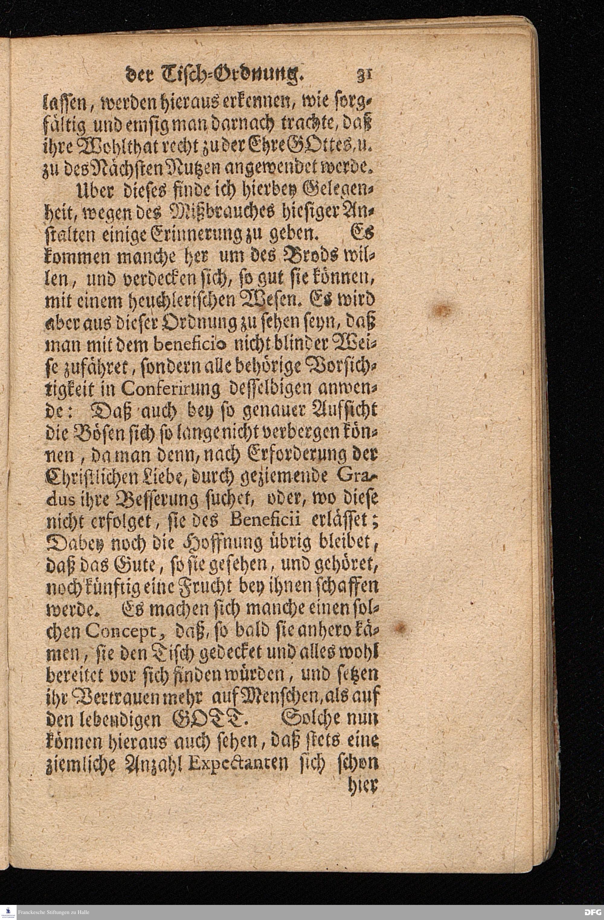Der von GOTT in dem Wäysenhause zu Glaucha an Halle (für ietzo auf 500. Personen) Zubereitete Tisch / Nach seinem Anfang / Fortgang / gegenwärtigem Zustand und eingeführter Tisch=Ordnung kürtzlich beschrieben, mit angehängten 2. Erweckungs Reden / Deren die erste Anno 1699. [vielmehr 1700!] bey Einweihung des damaligen kleinern Speise=Saals, Die andere Anno 1711. bey Einweihung des grossen Saals gehalten worden, von August Hermann Francken / S.Theol.Prof.& Past.zu S.Ulrich / und des Gymnasii Scholarcha, h.t. Acad.Pro-Rectore. HALLE, In Verlegung des Wäysenhauses, MDCCXVII.