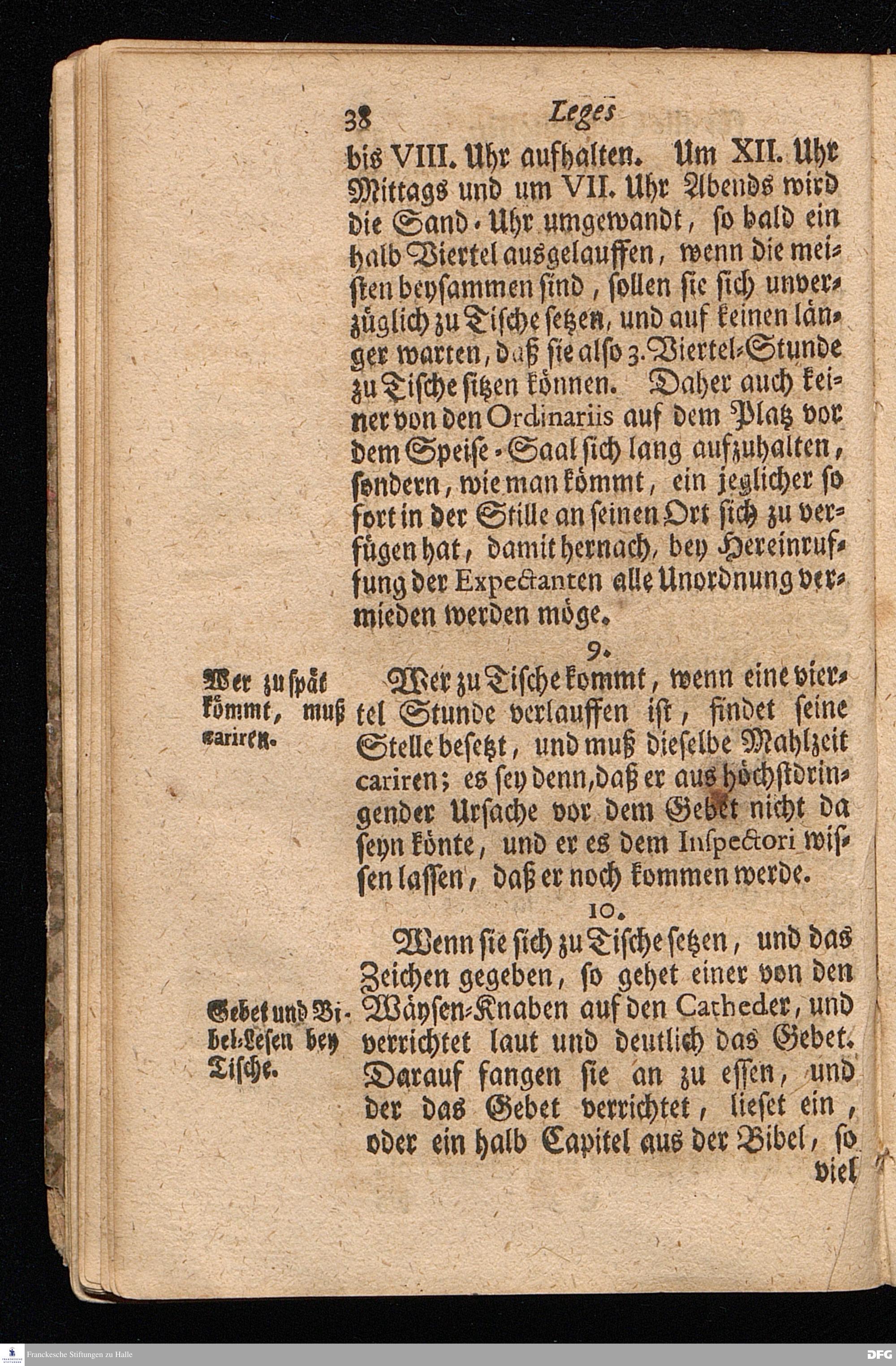 Der von GOTT in dem Wäysenhause zu Glaucha an Halle (für ietzo auf 500. Personen) Zubereitete Tisch / Nach seinem Anfang / Fortgang / gegenwärtigem Zustand und eingeführter Tisch=Ordnung kürtzlich beschrieben, mit angehängten 2. Erweckungs Reden / Deren die erste Anno 1699. [vielmehr 1700!] bey Einweihung des damaligen kleinern Speise=Saals, Die andere Anno 1711. bey Einweihung des grossen Saals gehalten worden, von August Hermann Francken / S.Theol.Prof.& Past.zu S.Ulrich / und des Gymnasii Scholarcha, h.t. Acad.Pro-Rectore. HALLE, In Verlegung des Wäysenhauses, MDCCXVII.